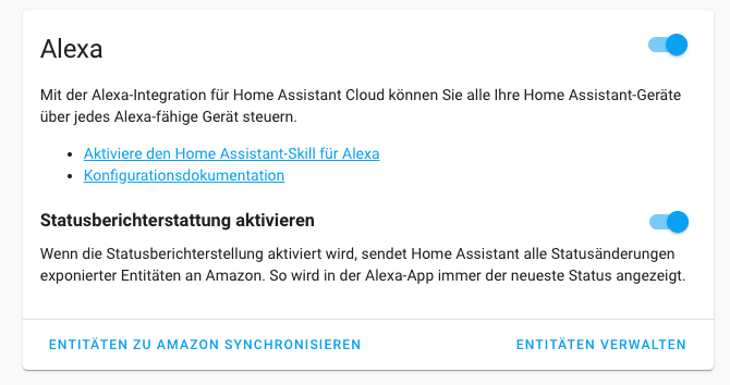Nachdem man die neue Konfiguration gespeichert und Home Assistant neu gestartet hat, werden diese Geräte automatisch zu Alexa übertragen und auch NUR diese. Entscheidet man sich später einmal, dass man ein Gerät mit einem anderen Namen aufrufen möchte, ändert man einfach den entsprechenden Eintrag in der cloud.yaml. Zwar ist das bei der ersten Einrichtung etwas Aufwand, dafür wird man aber mit einem übersichtlichen System belohnt, das auch auf die Sprachbefehle hört, die man nutzen möchte – und die man sich merken kann.