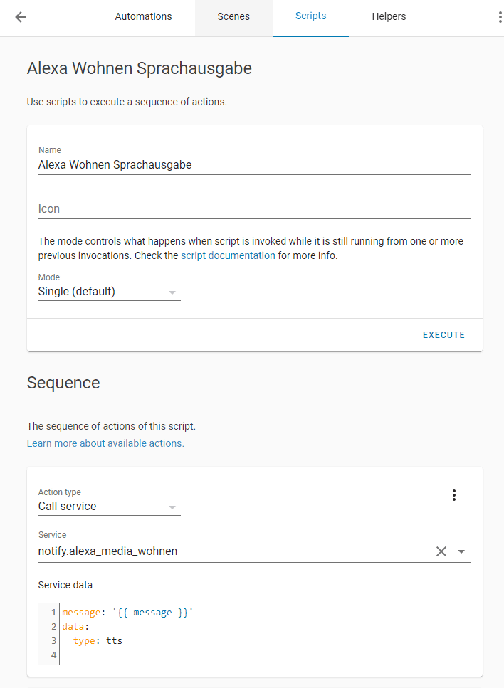 Die Action ist wieder ein Service. Der Service muss nun ein Script aufrufen, das wir selbst erstellen: Alexa Sprachausgabe. Dazu geht es in Configuration->Scripts und hier wird ein neues Benutzer-Script angelegt. Einer der großen Vorteile eines Scripts in Home Assistant ist, dass man beliebig viele Actions pro Script ausführen (Sequence) und Scripte flexibel wiederverwenden kann, sofern man sie intelligent mit Variablen gestaltet.