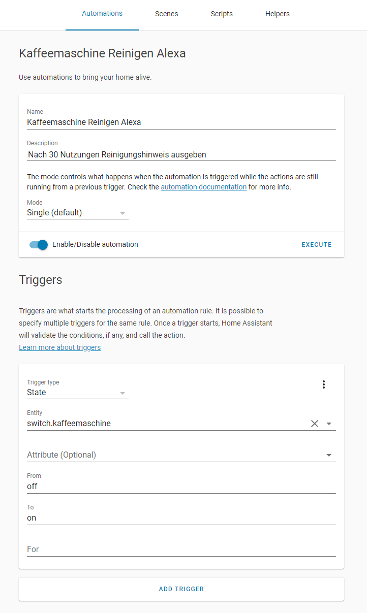 Um die Sache etwas übersichtlicher zu machen, legen wir eine weitere Automation an „Kaffeemaschine Reinigen Alexa„. Auch hier wieder der Single-Modus. Als Trigger wieder State wenn die Entität switch.kaffeemaschine von off auf on wechselt.