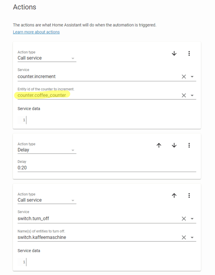 Das können wir gleich in die vorherige Automation einbauen, in dem man eine weitere Action anlegt. Diesmal VOR dem Delay, denn der Zähler soll ja gleich beim Einschalten um eins erhöht werden. Hier wird nun wieder ein Service aufgerufen, diesmal der counter.increment Service. Dem müssen wir nur noch mitteilen, welchen Counter er erhöhen soll, nämlich den counter.coffee_counter. Mit den Pfeilen rechts kann man die Action nun nach oben vor unsere Delay Action schieben.