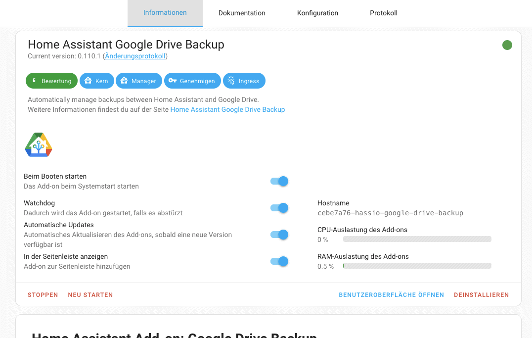 Mit dem Add-On Home Assistant Google Drive Backup, kann man alle Einstellungen und Daten automatisch zu Google Drive übertragen und bei Bedarf auch wiederherstellen.