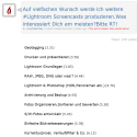 Auf Platz 1 stehen die Themen Korrekturpinsel, Verlaufsfilter & Co., Platz 2 geht an die einfachen Bildverbesserungen und Platz drei an das Thema S/W Entwicklung mit Lightroom. Am wenigsten interessieren demnach die Lightroom Grundlagen und an letzter Stelle der Bereich Geotagging.