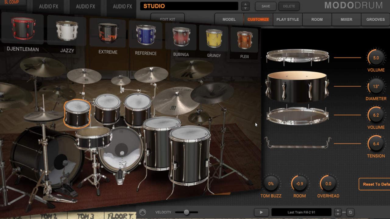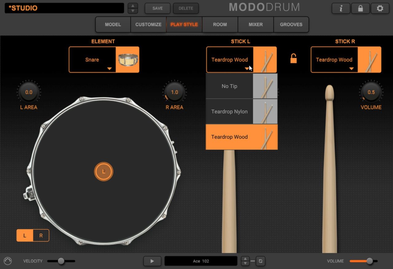 Genau das sind die neuen Möglichkeiten von MODO Drum. Man kann eine Trommel stimmen, ohne dabei nur ein Sample zu verstimmen. Vielmehr wird der Sound neu berechnet. So kann auch die Aufschlagposition- und Fläche jeder Trommel und deren Raumanteil festgelegt werden. Strike 2.