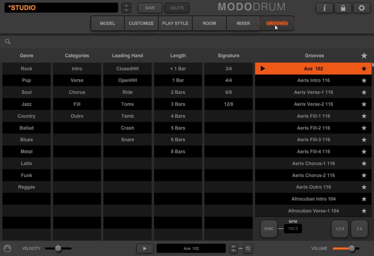 Eine Groove-Bibliothek mit 1400 Pattern bringt MODO Drum mit, man muss aber auf einen integrierten Editor für Rhythmen ebenso verzichten, wie auf eine Möglichkeit zum Mapping von MIDI-Noten zu Drum-Sounds. Für Drummer mit MIDI-Drumset und Trigger-Modul kann das eventuell zu Problemen führen. Dafür kann man bei den mitgelieferten MIDI-Pattern auch die führende Hand auswählen und die Auswahl überzeugt durch hohe Praxistauglichkeit. Strike 4