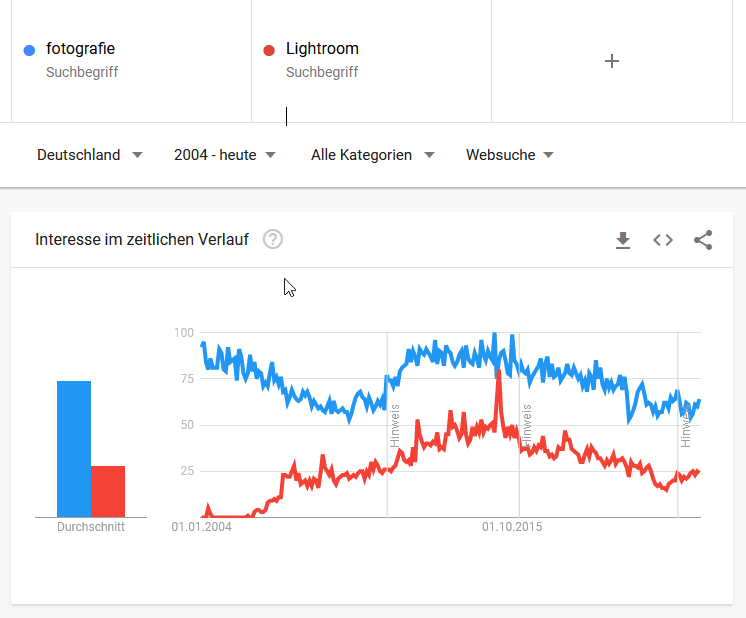 Darum haben sich die Themen in den letzten 3 bis 5 Jahren auch weiter weg vom ursprünglichen Hauptthema „Fotografie & Lightroom“ bewegt und für mich ist das Thema auch etwas ausgelutscht. Technisch tut sich nicht mehr viel und durch das Smartphone ist die Fotografie bei allen angekommen. Ich war auch immer „Gebrauchsfotograf“, der Produkte und Werbefotos machte (und beruflich, neben anderen Dingen, noch immer macht). Sieht man sich das Thema bei Google Trends im zeitlichen Verlauf an, sieht man, dass auch das Interesse insgesamt schwindet. Ich habe das Gefühl, nichts mehr Relevantes dazu beitragen zu können, was nicht schon zigmal geschrieben wurde.