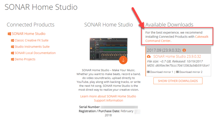 Am einfachsten ist es, das Cakewalk Command Center herunterzuladen. Von da aus kannst du alle Inhalte und Updates installieren und Sonar Homestudio kostenlos registrieren.