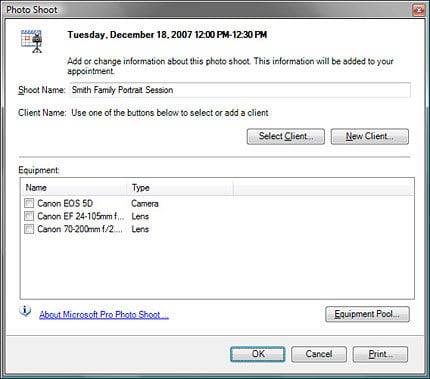 Damit wir nun beim nächsten Shooting nicht unseren Kopf vergessen, legen wir mit Pro Photoshoot einen neuen Termin mit einer Beschreibung des Shootings an, wählen durch einfaches Anklicken das benötigte Equipment aus der Inventarliste aus und können aus den Outlook-Kontakten den zugehörigen Kunden zuweisen. FERTIG!