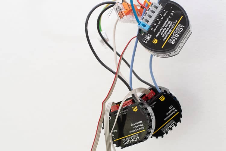 Die Module gibt es für die Unterputz (UP) Installation direkt in einer Unterputzdose, aber auch für die zentrale Installation im Schaltschrank als Hutschienenmodule. So gibt es z. B. das LCN-UPP Modul, das zwei schalt- oder dimmbare Ausgänge hat sowohl für die UP-Installation als auch für den Schaltschrank. Man kann sich somit entscheiden, ob man eine zentrale Installation möchte, bei der die „Intelligenz“ im Schaltschrank sitzt, oder eine dezentrale Variante, mit Modulen in den Bereichen, in denen sie auch wirken sollen. Letzteres ist gerade bei der Nachrüstung oder Renovierung interessant, da ggf. nur neue Kabel in Leerrohre eingezogen werden müssen, die eine weitere Ader für den LCN-Bus haben.