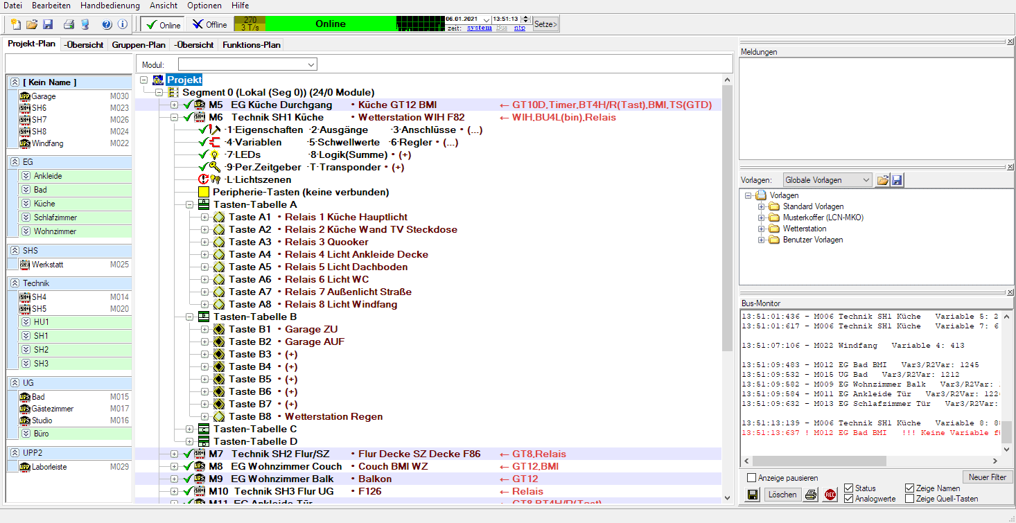 Mit der LCN-Pro Software und der Status-Übersicht und deren Kommando-Funktionen kann man aber alle Funktionen prinzipiell auch komplett darüber testen, ohne dass man durchs Haus rennen müsste, um einen Taster zu drücken oder um zu sehen, ob das Licht nun tatsächlich wieder aus ist. Der Bus-Monitor zeigt dabei auch alle Statusmeldungen an und man gezielt nach Modulen, Ereignissen oder Fehlern filtern. Diese Ausgaben lassen sich auch in einer Text-Datei mitloggen, um Fehlern und ungewöhnlichem Verhalten auf die Schliche zu kommen.
