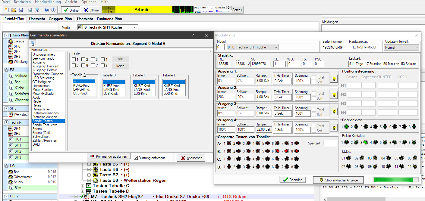 Das ist auch gleichzeitig eine der Herausforderungen bei LCN: Es gibt viele Möglichkeiten, bestimmte Funktionen umzusetzen und die Kombination verschiedener Funktionen ermöglicht sehr komplexe Schalt- und Regelverhalten. „Verzögerte Tasten“, „gesperrte Tasten“ oder die Tasten-Tabellen müssen erst einmal erkundet und verstanden werden.