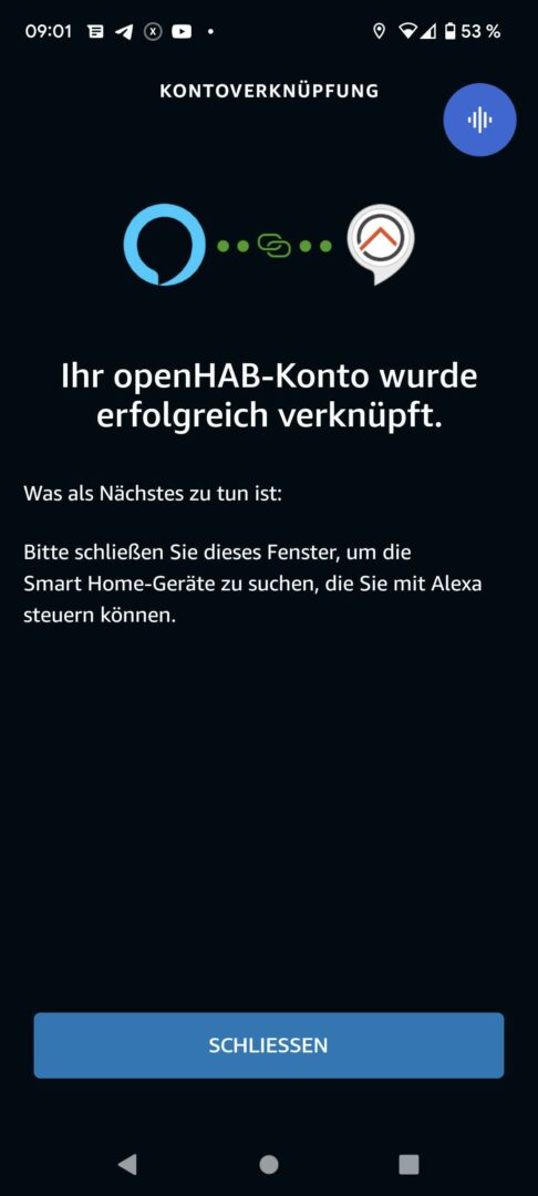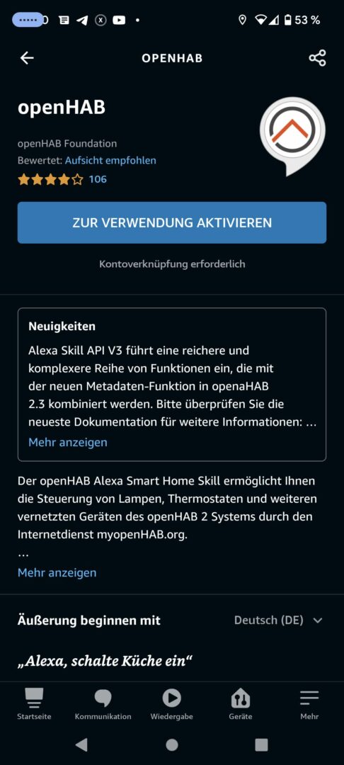 Bei der Anbindung an Amazons Alexa installiert man über die Alexa App den OpenHAB Skill. Dieser wird anschließend für die Nutzung der OpenHAB Instanz mit dem OpenHAB Benutzer und Passwort autorisiert. Alexa erkennt anschließend alle Ausgänge, Lampen, Sensoren etc. als neue Geräte und man kann die, die man per Sprachbefehl steuern möchte, aktivieren. Einfacher geht es kaum.