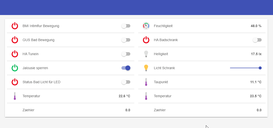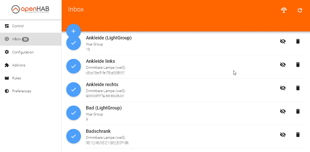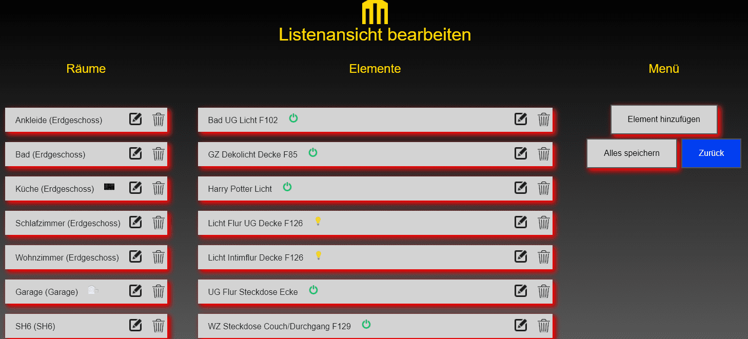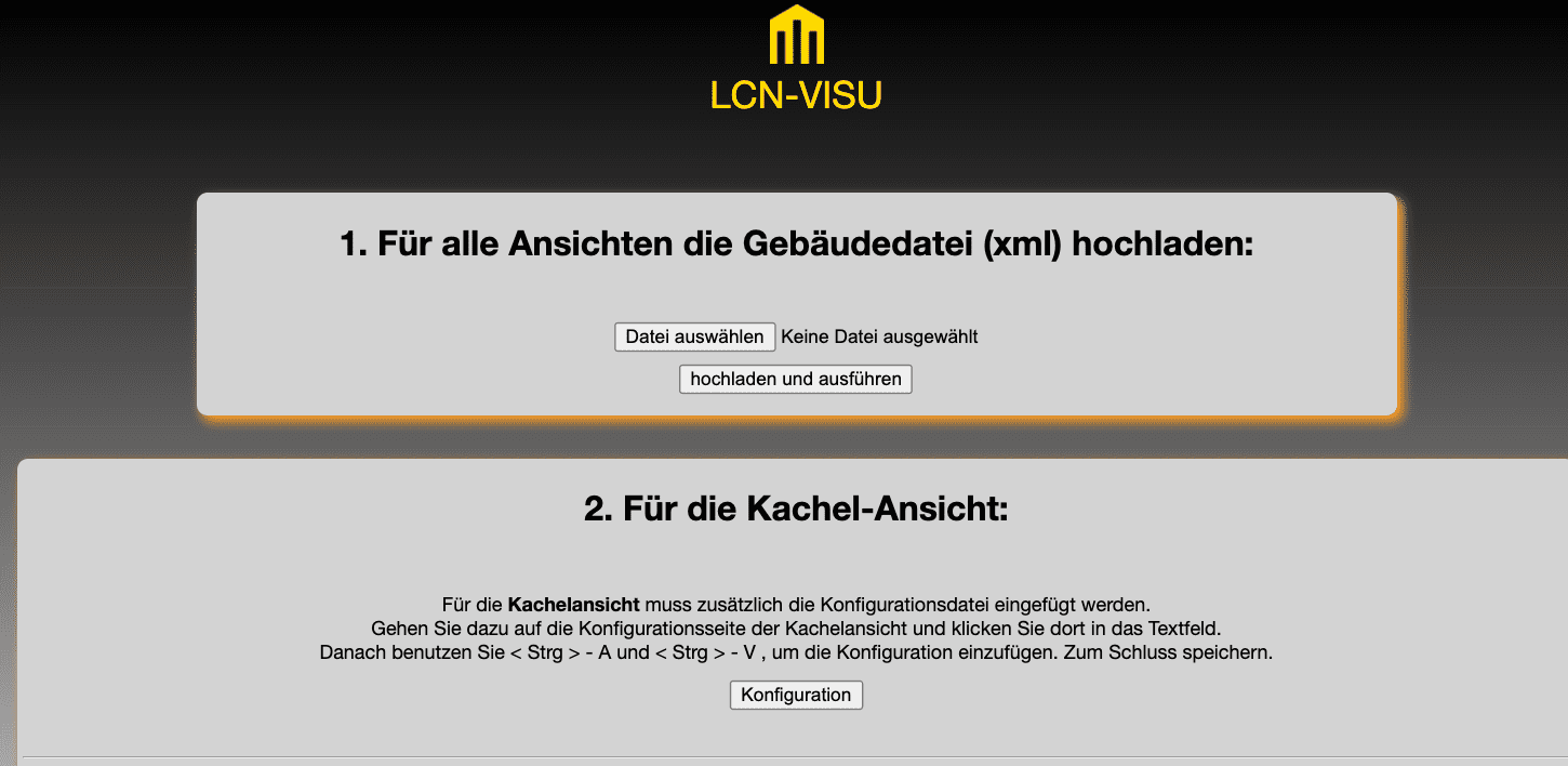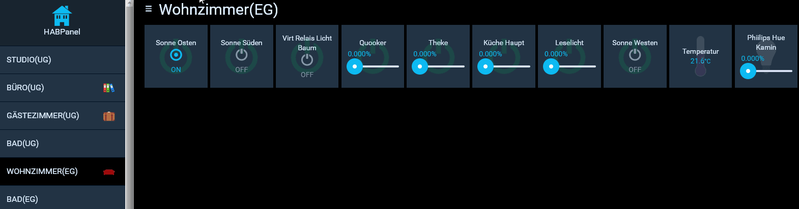 Hat man in der LCN-Pro alles passend benannt und gruppiert, kann man unter Datei eine XML-Version der aktuellen Konfiguration exportieren, die man anschließend in der LCN-VISU Oberfläche unter Ansichten erstellen hochladen kann. Nach dem Upload und einem automatischen Neustart des Moduls, stehen die LCN-Ausgänge, Sensoren etc. in der OpenHAB Listenansicht bereits zur Verfügung und man kann nun über die Weboberfläche schalten und walten.