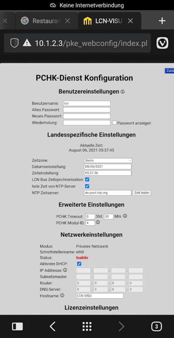 Nach der Anmeldung mit lcn/lcn für Benutzernamen und Passwort, kann man die Ersteinrichtung und damit die Einbindung ins vorhandene Netzwerk vornehmen. Die WLAN-Funktion des LCN-VISU dient allerdings ausschließlich zur Einrichtung. Für den Betrieb ist zwingend ein kabelgebundener Netzwerkanschluss nötig. Allerdings ist das auch verständlich, denn im geschlossenen Verteilerschrank, hätte der Zugriff per WLAN ohnehin seine Grenzen.