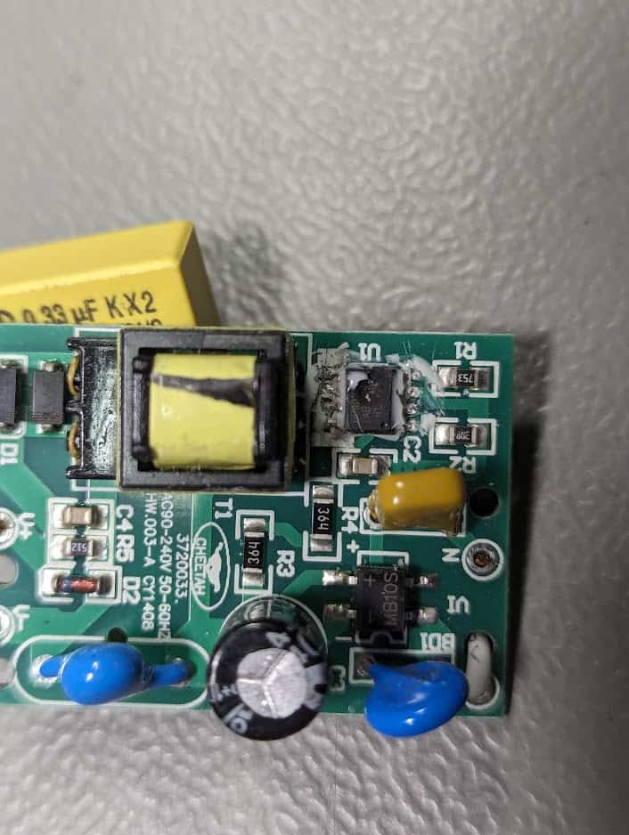 Der Treiber für die LED-Beleuchtung befindet sich im oberen Teil der Maschine, hinter der Umlenkrolle und lässt sich auch ohne Ausbau der Rolle demontieren. Darin befindet sich ein kleiner Treiber mit Schaltnetzteil und hier ist der Schaltregler defekt, was man am aufgeplatzten Gehäuse gut erkennen kann.