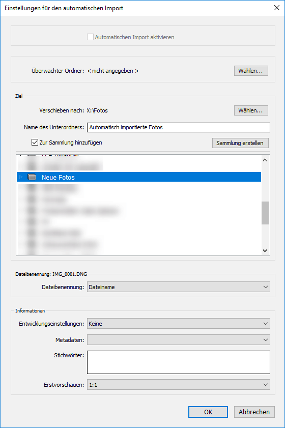 Überwachte Ordner gibt es in Lightroom schon ziemlich lange. Nun kann man den automatischen Import aus diesem überwachten Ordner auch eine Sammlung zuweisen. Dieser Autoimport ist so sehr viel praktischer geworden. Definiert man einen beliebigen Ordner auf dem Rechner als Autoimport-Ordner (unter Datei->Automatisch Importieren -> Einstellungen für den automatischen Import) und vergibt hier eine Zielsammlung wie z. B. „Neue Fotos“, kann man die Fotos von der Speicherkarte einfach in diesen Ordner werfen und beim nächsten Start von Lightroom werden sie automatisch in den Katalog und in Lightroom importiert.