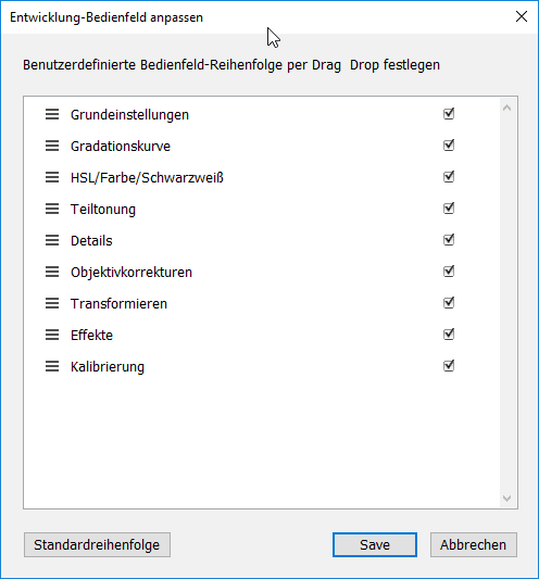 Die neue Lightroom-Version ermöglicht es nun, dass man die Anordnung der Bedienfelder im Entwicklungsmodus nach belieben umsortieren kann. Nicht benötigte Bedienfelder lassen sich sogar komplett ausblenden. Einfach einen rechten Mausklick auf die Titelzeile eines Bedienfelds (z. B. Grundeinstellungen) machen und „Entwicklung Bedienfeld anpassen …“ auswählen.