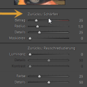 Nun kann man einfach auf den Titel klicken und alle Schärferegler werden auf den Standardwert gesetzt. So muss man nicht jeden Regler einzeln wieder auf Null bringen, was erheblich Zeit spart.