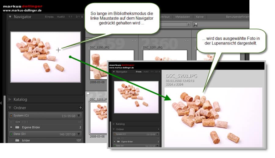 Wenn man sich im Bibliotheksmodus befindet und ein Bild selektiert hat, genügt es, die linke Maustaste im Navigator gedrückt zu halten, um eine temporäre Groß(Lupen-)ansicht des Fotos zur erhalten. Lässt man die Maustaste los, gehts sofort zurück zur Bibliotheksansicht.