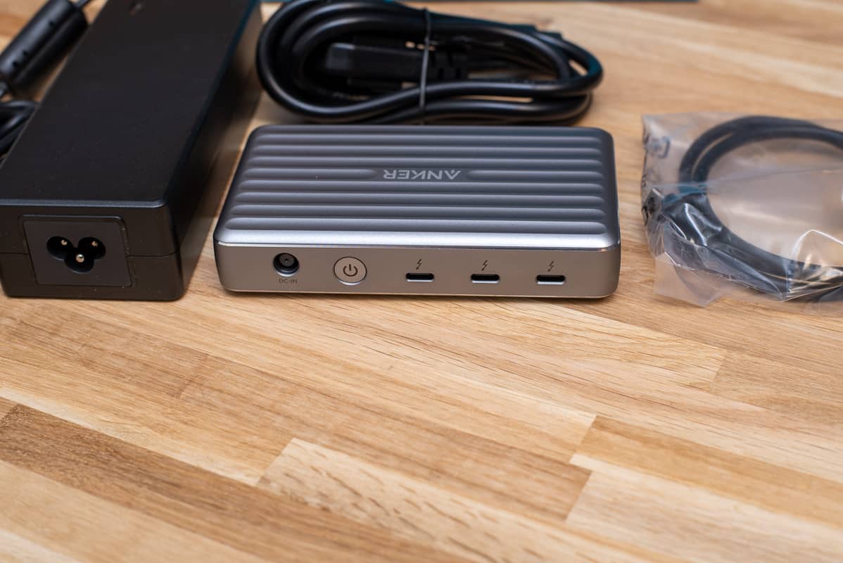 Von Anker gibt es das PowerExpand 5-in-1 Thunderbolt 4 Mini Dock. Dieser hat einen Uplink-Eingang, der auf 3 Thunderbolt 4 Anschlüsse mit 40 Gbps sowie einen USB 3.1 mit 10 Gbps Anschluss erweitert wird. Zusätzlich liegt dem Anker Dock ein 85 Watt Netzteil bei, mit dem angeschlossene Geräte mit Strom versorgt und geladen werden können. Bei einem Notebook kann man so auf das Netzteil des Notebooks verzichten. Mit meinem neuen 14″ Apple MacBook Pro M1 klappt das wunderbar. Ist am Anker Dock ein externes Display angeschlossen, wird es darüber auch sofort nutzbar, wobei hier Auflösungen bis 8k möglich wären.