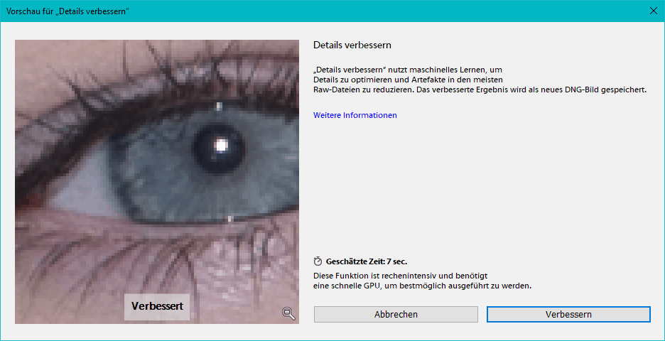 Dabei ist ebenfalls zu beachten, dass die Berechnung dieser Detailverbesserung stark von der Grafikkarte abhängt. Eine schnellere GPU, erzeugt auch eine schnellere Voransicht. Spielte die Grafikkarte bei Lightroom bislang nur bei hochauflösenden 5k Displays eine Rolle, wird sie nun wohl doch wichtiger.