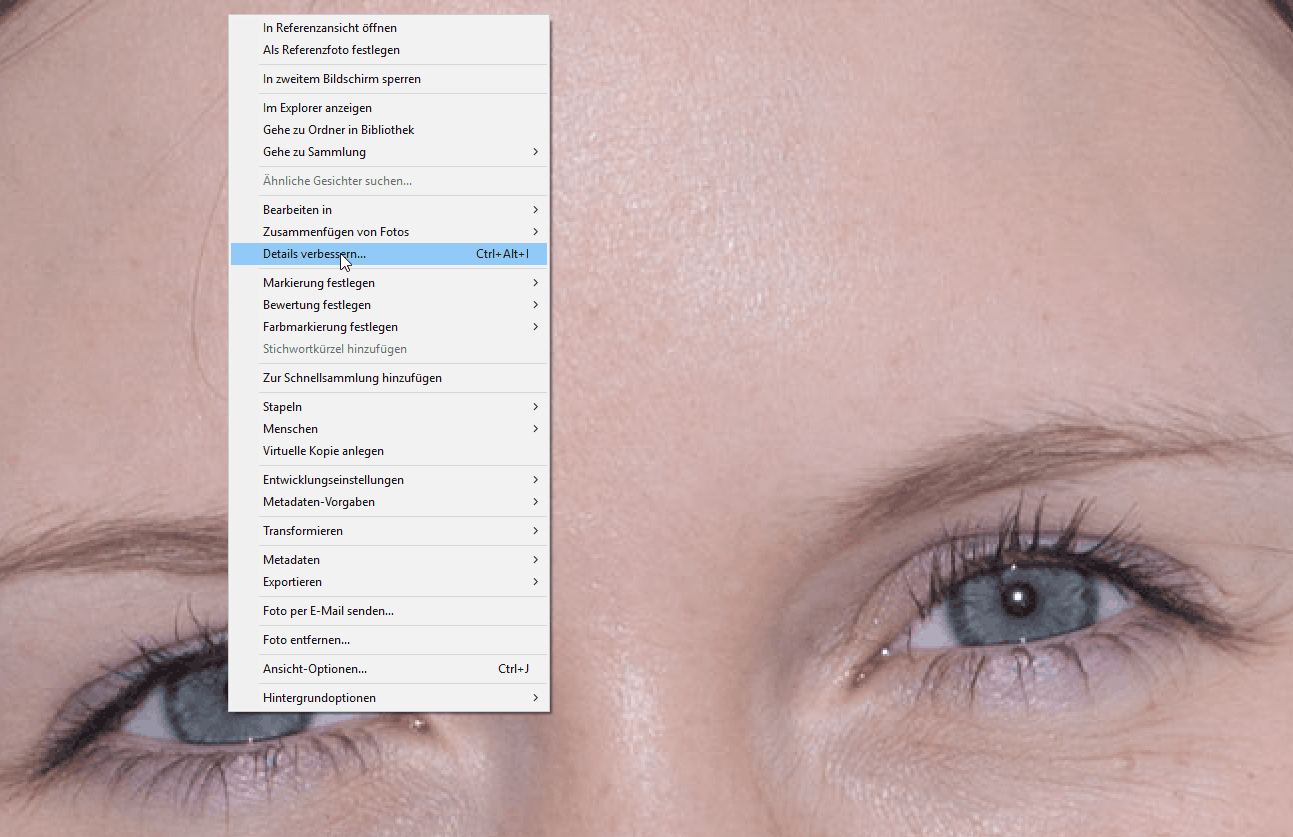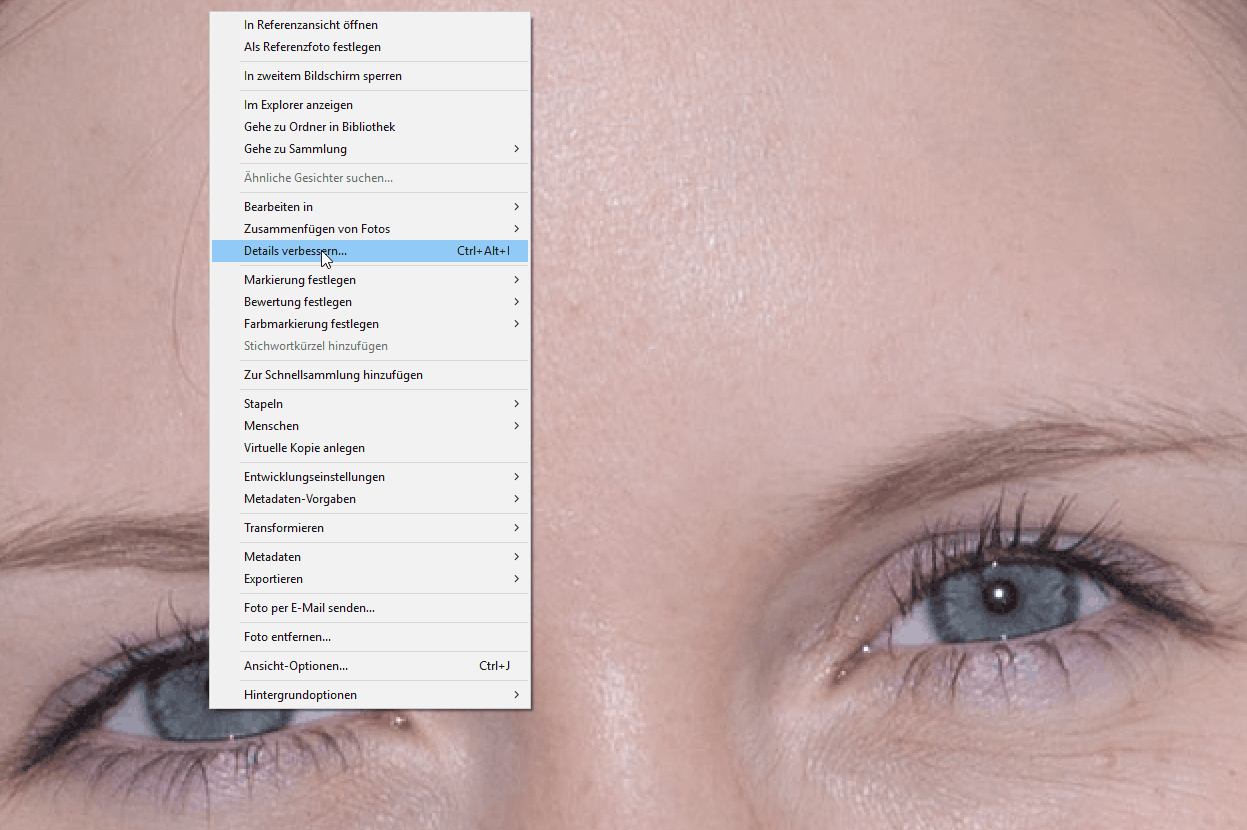 Zunächst müsst ihr ein Foto im RAW-Format auswählen. Details verbessern funktioniert nicht mit JPG-Fotos, da hier das Debayering bereits in der Kamera erfolgte. Ihr klickt dann entweder mit der rechten Maustaste auf das Bild und wählt „Details verbessern“ aus oder nutzt die Tastenkombination STRG+ALT+i.