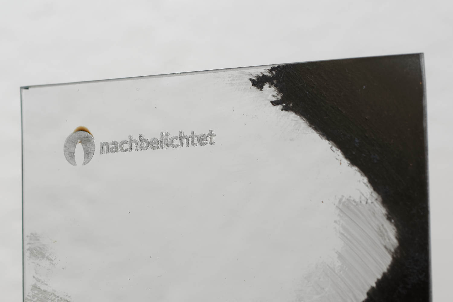 Durch das gute Ergebnis beim Aluminium habe ich noch einmal die Gravur einer Glasplatte versucht. Der Marker brachte hier nicht genügend Deckung, damit der Laserstrahl gut absorbiert werden kann. Darum habe ich mattschwarzes Acrylfarbspray dünn aufgetragen und kurz antrocknen lassen. Danach habe ich mit 4 mm/s und 100 % Leistung graviert. Die Glasplatte lag dabei auf zwei Holzklötzchen mit etwa 15 mm Abstand zum Untergrund.