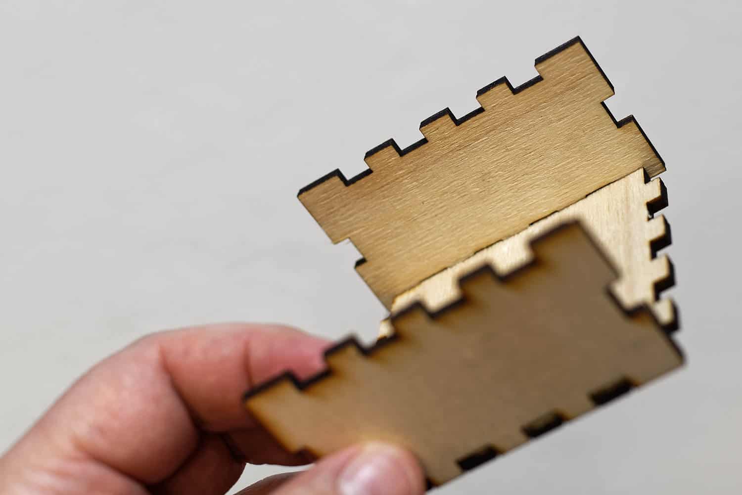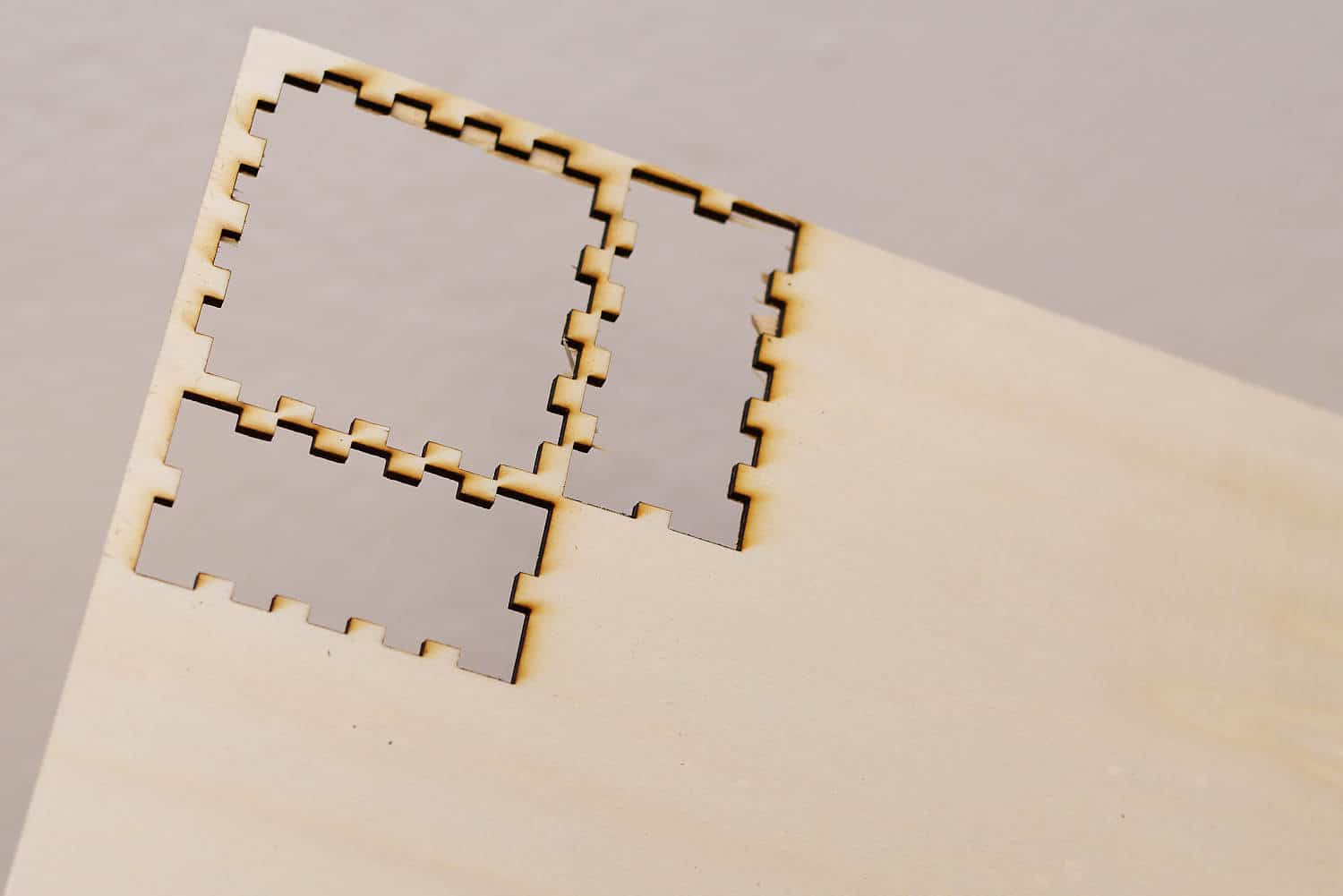 Dieses Pappelsperrholz lässt sich mit 8 mm/s und 10 Durchgängen perfekt schneiden. Dabei habe ich einen kleinen PC-Lüfter so positioniert, dass der Rauch weggeblasen wird, was zu weniger Rauchspuren auf dem Holz sorgt.