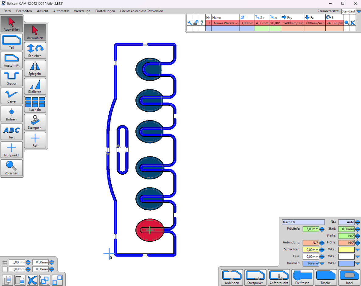 Der Vorschub war 1400 mm/min, Eintauchgeschwindigkeit 600 mm/min, Zustellung 4 mm. Die Fräsdatei habe ich in Estlcam 12 erstellt. Dabei werden erst 6 Taschen mit 5 mm Tiefe und dann die Ausschnitte gefräst. Die Stege sind 4 mm breit und 3 mm hoch. Das hält perfekt und sie lassen sich fast werkzeugfrei trennen. Die Frästiefe war insgesamt 11 mm.