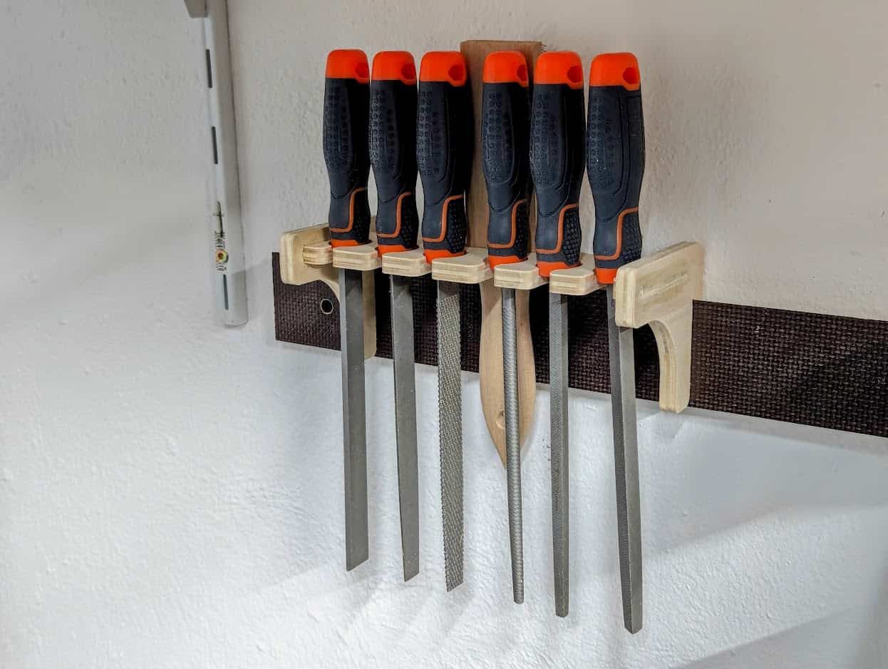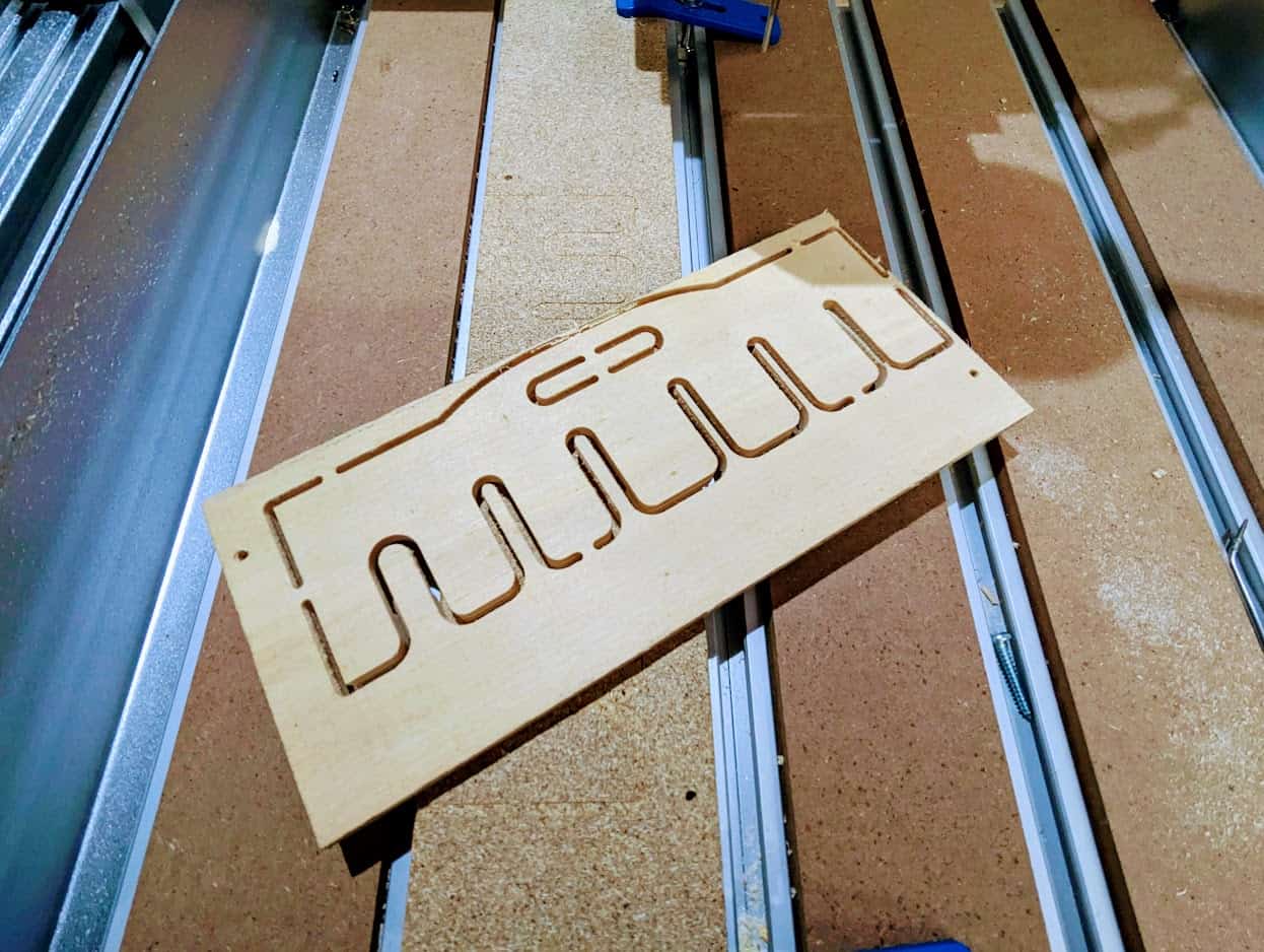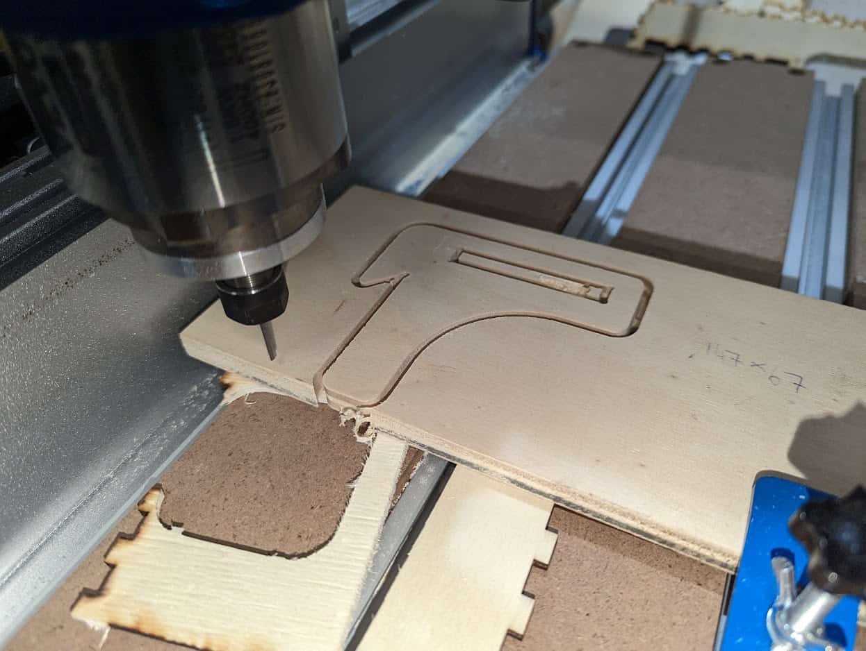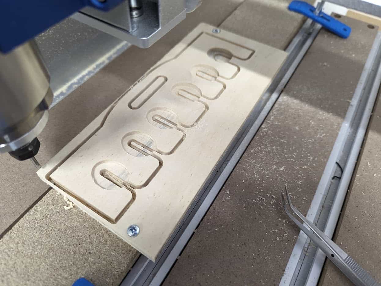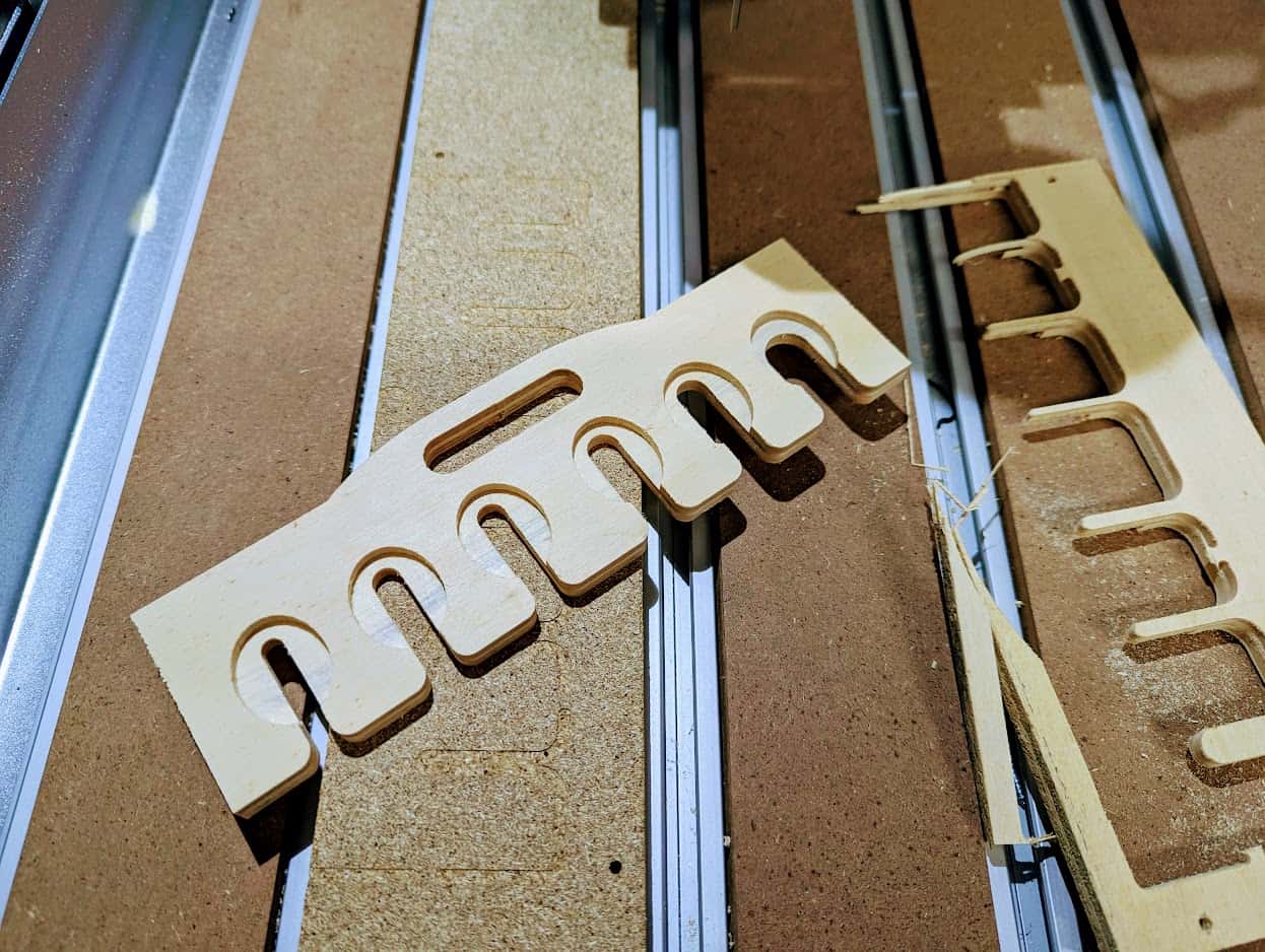 Nach einigen Testläufen habe ich eine French Cleat Halterung für meine neuen Presch Feilen in Solidworks entworfen und gefräst. Als Material kamen 10 mm Birkensperrholzreste zum Einsatz. Der Fräser ist eine gerade zweischneidige Flöte mit 3,175 mm. Ich habe dazu diese Schaftfräser von Amazon getestet und bin mehr als zufrieden damit. Die Kanten sind sehr sauber und bedürfen (bis auf das Entfernen der Anbindungen) keinerlei Nacharbeit.