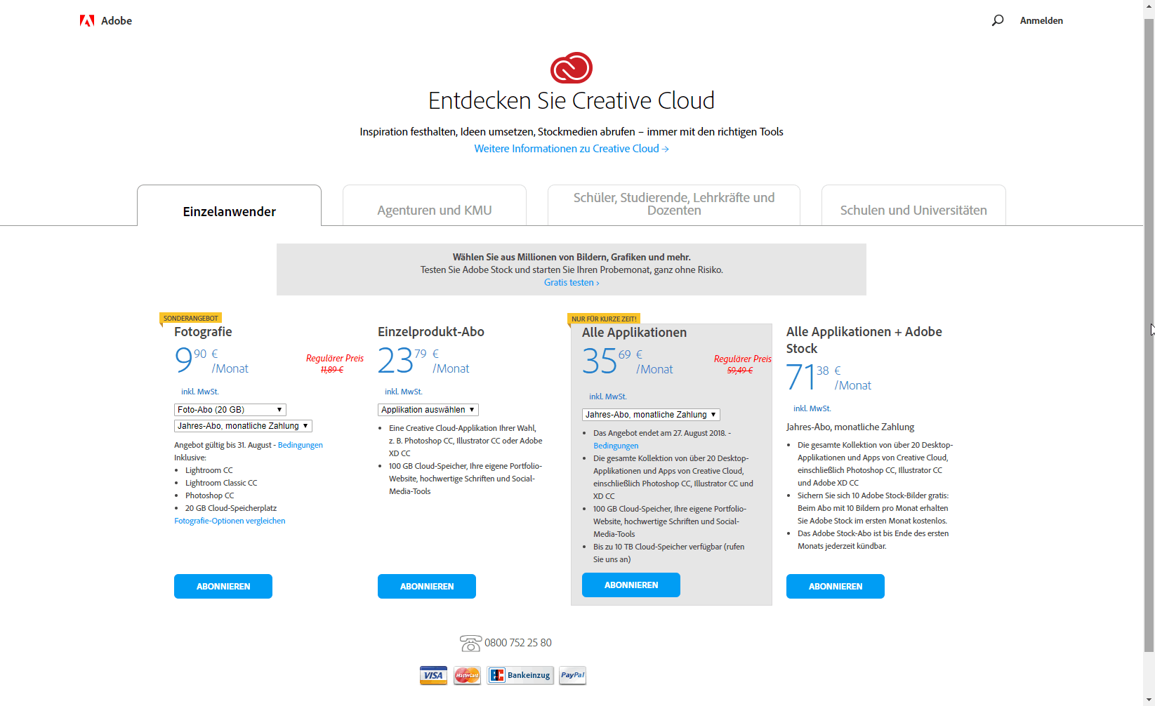 Wenn ihr die komplette Suite mit Adobe Premiere, Indesign, Illustrator, After Effects und und und haben möchtet, kostet diese derzeit nur 35,69 Euro statt regulär 59,49 pro Monat.
