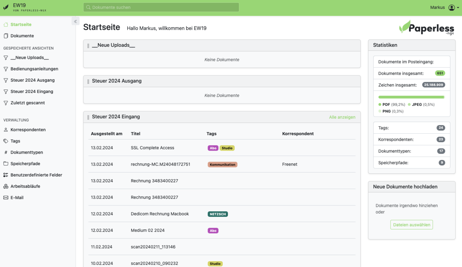 Selten habe ich eine Anwendung getestet, die mich so begeistert hat. Paperless NGX funktioniert einfach. Es kann Ordner überwachen, in die man einfach PDFs, Scans und Bilder wirft und Paperless NGX importiert sie automatisch.