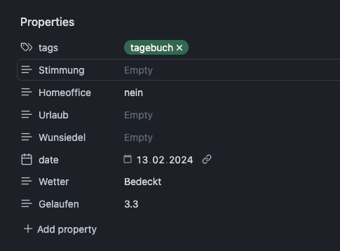 Mit Frontmatter kann man Metadaten in Notizen hinterlegen. Das ist besonders bei Vorlagen interessant. So habe ich in meinem Tagebuch-Template die Metadaten Wetter, Stimmung, gelaufene Kilometer etc. als Metadaten im Kopf der Datei. Diese Metadaten lassen sich dann wieder durchsuchen, automatisch verlinken etc. etc.