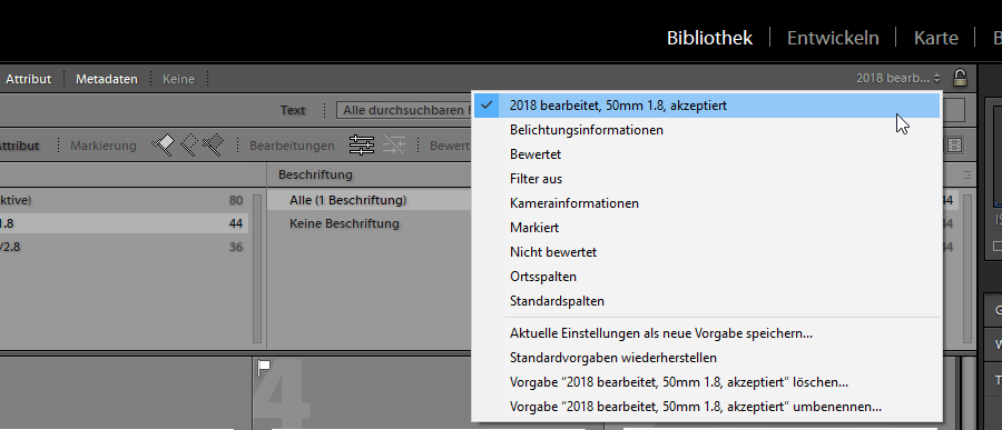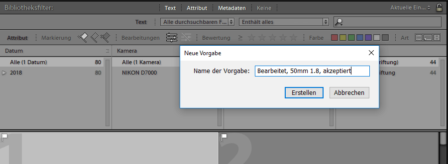 Damit hat man ein sehr praktisches Hilfsmittel, wenn man häufig nach den gleichen Dingen sucht. Gerade eine Suchvorgabe wie „Ausgewählt, nicht bearbeitet, 5 Sterne“ etc. kann hilfreich sein, wenn man erst längere Zeit nach einem Shooting zur Bearbeitung kommt. Natürlich könnt ihr auch bestimmte Wörter, Stichwörter, Brennweiten, Kameramodelle etc. mit in eure Suche aufnehmen und damit ziemlich komplexe Suchen mit zwei Mausklicks durchführen.
