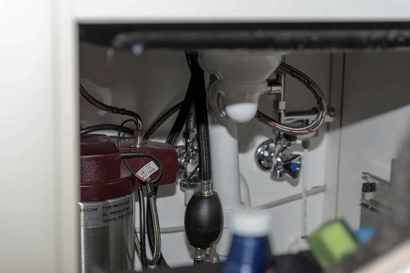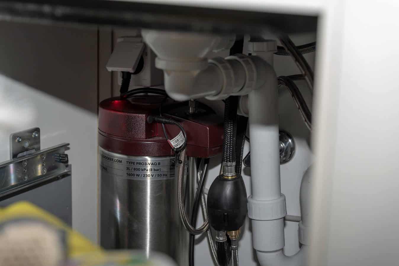 Wir haben den Quooker Flex in Chrom zusammen mit dem PRO3 Reservoir im Einsatz. Der PRO3 ist ca. 40 cm hoch und misst 15 cm im Durchmesser. Da wir einen Mülltrenneinsatz in unserem Spülunterschrank haben, hatten wir schon bedenken, dass wir das Reservoir nicht unterbringen würden. Tatsächlich war aber hinten im Schrank noch genügend Platz, um den PRO3 unterbringen zu können. Das Reservoir steht übrigens sehr gut von selbst – es wird aber auch eine spezielle Halterung angeboten. Spülenschränke sind üblicherweise hinten immer offen und haben auch noch ein paar Zentimeter Abstand zur Wand, sodass der PRO3 tatsächlich in den meisten Küchen unterzubringen sein dürfte.