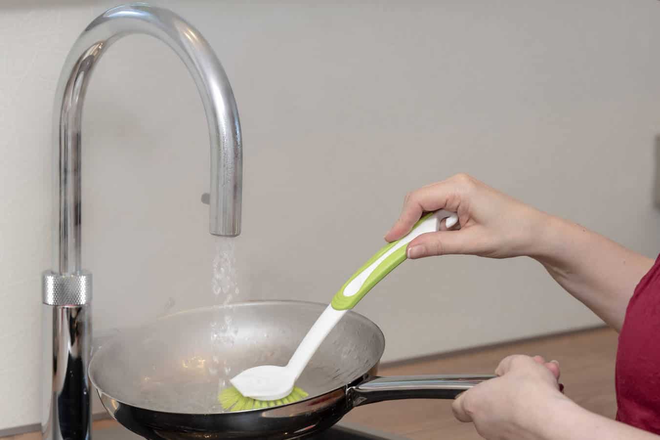 Ich setze praktisch nur Eisen- und Edelstahlpfannen ein. Beide haben nichts im Geschirrspüler verloren. Eisenpfannen rosten unweigerlich und bei Edelstahlpfannen beginnt das Bratgut zu kleben. Darum sollten diese nur mit heißem Wasser und ohne Spülmittel gereinigt werden. Hier hat sich der Quooker als extrem hilfreich erwiesen, denn das kochende Wasser entfernt selbst hartnäckigste Rückständen ganz ohne Geschirrspülmittel etc. So lässt sich eine Pfanne gleich nach dem Einsatz in kürzester Zeit für eine weitere Anwendung einsetzen.