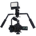 Die DSLR Kamera ruht auf einer rahmenartigen Kameraschiene, die in 2 zueinander rechtwinkligen Achsen wie bei einem Kardangelenk schwingt. Das Gewicht der Kamera hält den Rahmen horizontal. 2 Handgriffe mit Bewegungshemmung (Drag) dienen zur Führung von FloPod und Kamera. Ein Zubehörschuh oben auf dem Gelenk unterstützt eine optionale Videoleuchte. Die Kamera selbst wird mittels Schnellwechselplatte auf der Schiene befestigt und je nach Modell austariert. Mitgeliefert wird ein Zusatzring zum manuellen Zoomen während des Filmens. Die solide Einrichtung aus Aluminium wiegt nur 900 g und kann schnell montiert werden.