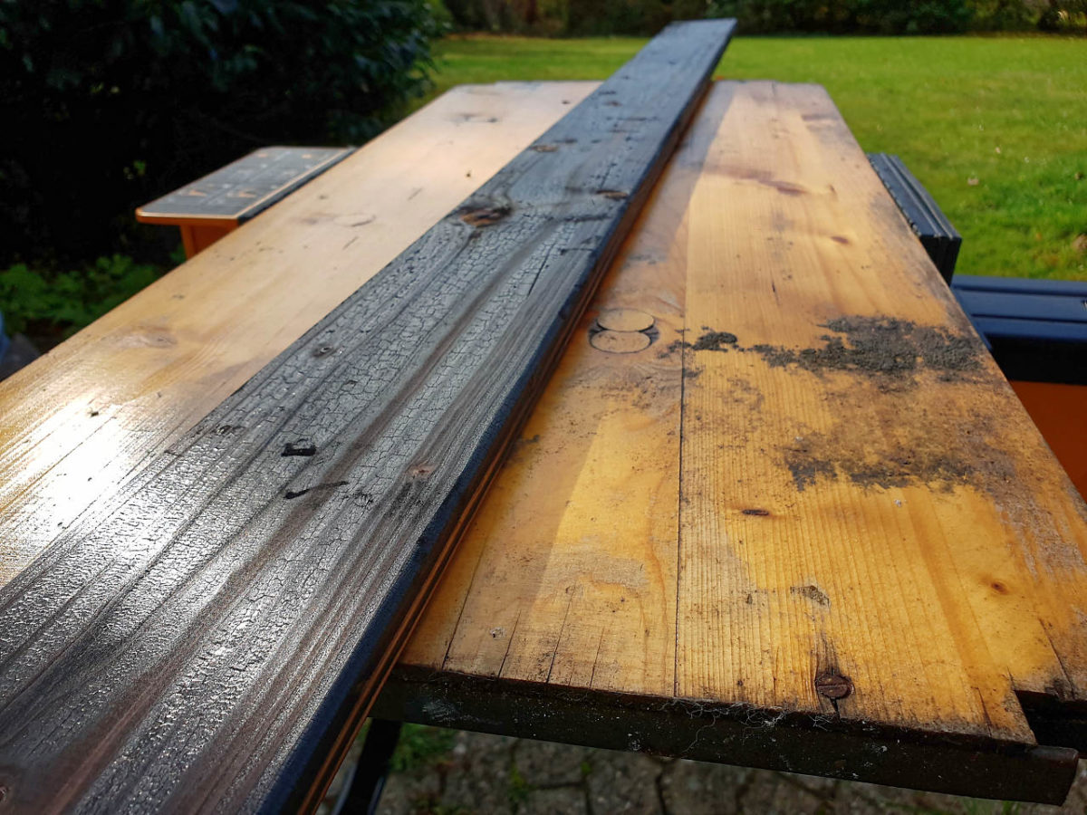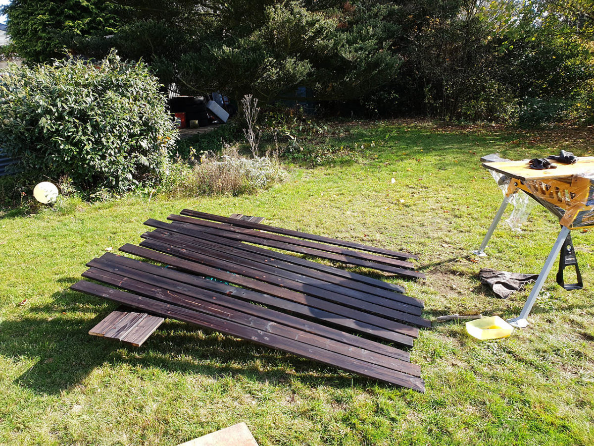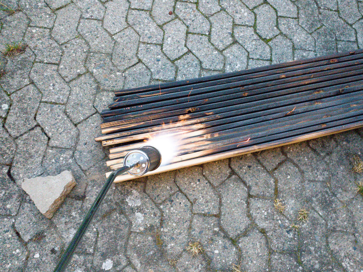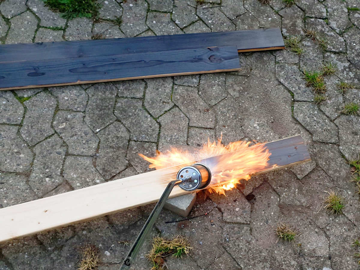 Die Bretter für die Front habe ich mit einem Gasbrenner verbrannt. Dazu geht man mit starker Flamme langsam aber gleichmäßig mit einem Abstand von ca. 20 Zentimetern über die Bretter, bis die Oberfläche den gewünschten „Verbrennungsgrad“ erreicht hat. Für 15 Bretter muss man dafür etwa eine Stunde veranschlagen. Bei meinen Brettern löschten sich kleine Flammen automatisch. Will man eine stärker verbrannte Oberfläche, muss man das Holz mit einer Gießkanne und Wasser löschen und trocknen lassen.