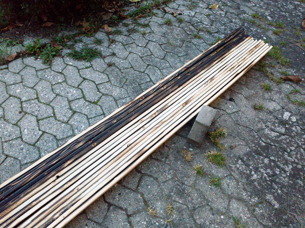 Da das auch noch schick aussehen soll, habe ich mich für die Shou Sugi Ban Optik entschieden. Dabei wird das Holz an der Oberfläche verbrannt und kann dann mit einer Bürste auf einen besonderen Look getrimmt werden. Ein netter Nebeneffekt ist, dass man dazu sehr günstiges Holz verwenden kann – es muss nicht einmal gehobelt sein, da die abstehenden Fasern durch das Abflammen ohnehin verschwinden.