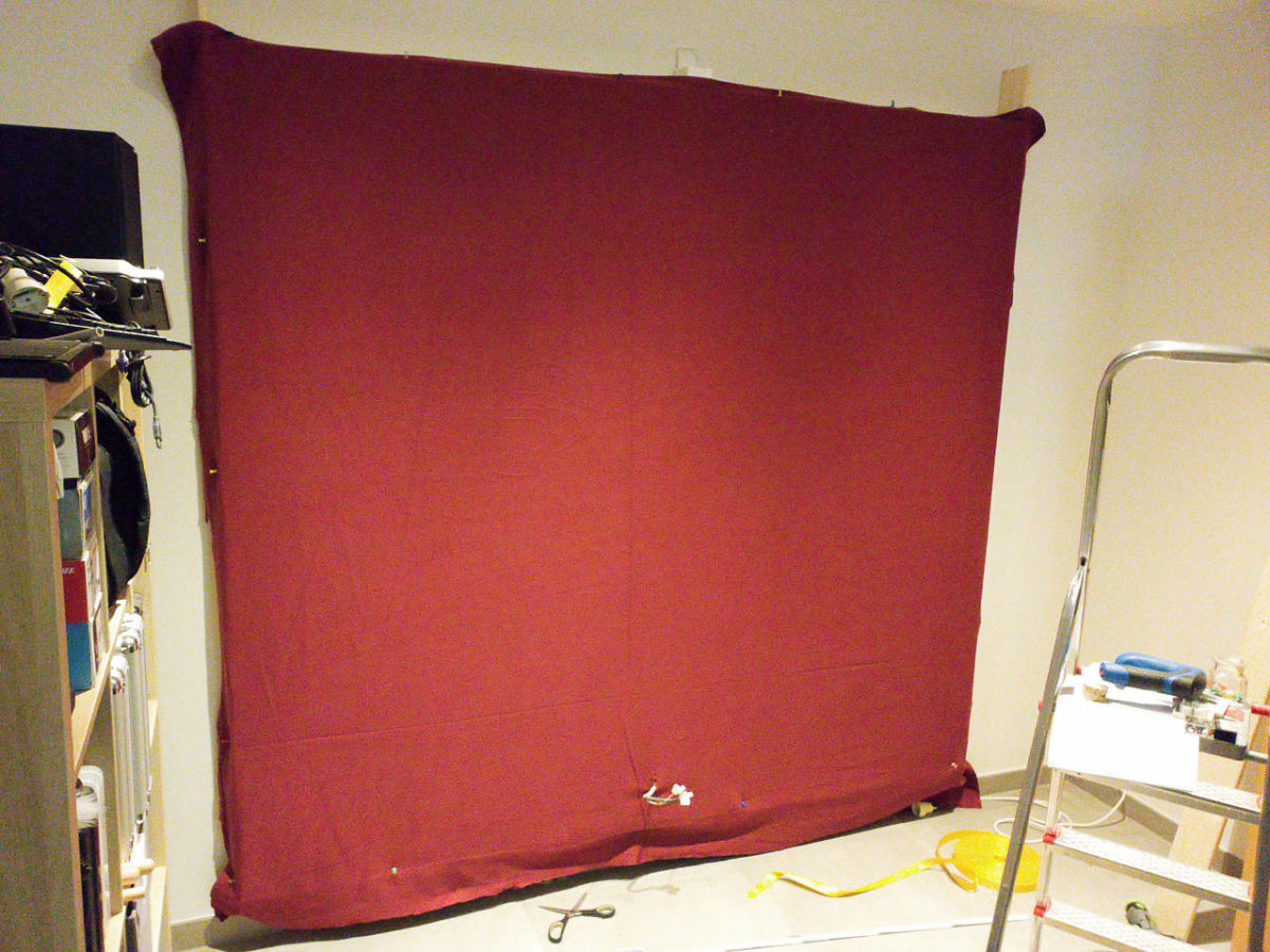 Nachdem alle montiert war, habe ich die Front mit einem 300 g/m² Molton bezogen. Dazu schneidet man den Molton auf das erforderliche Maß und gibt noch einige Zentimeter zu. Es ist übrigens sehr viel einfacher, wenn man den Stoff vor dem festtackern zunächst mit Pinwandnadeln fixiert. Damit kann man problemlos korrigieren und bei meiner 2 x 2 Meter Wand war das so auch ohne weitere Hilfe zu bewerkstelligen.