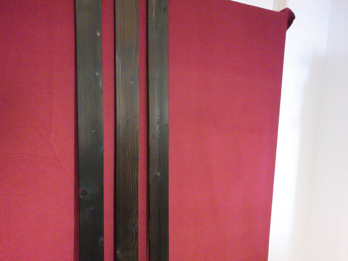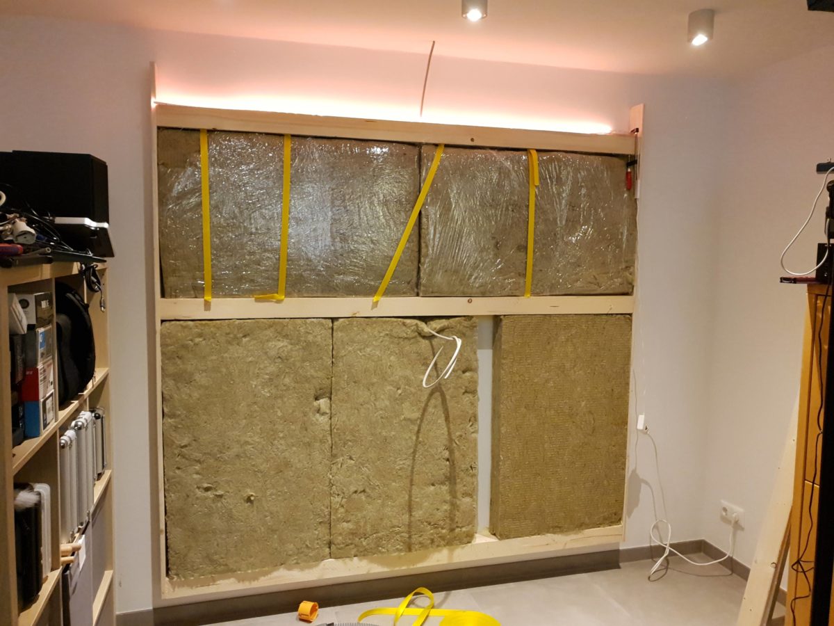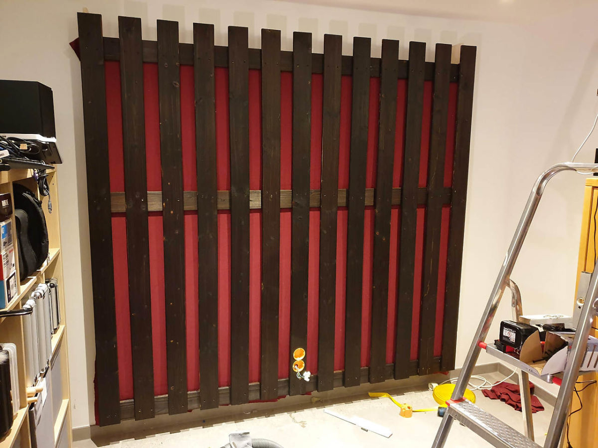 Ich richte mir gerade ein kleines Homestudio ein und dazu muss natürlich auch die Raumakustik stimmen. Da ich auch meine vielen Bässe und Gitarren unterbringen muss, war meine Idee, einen Absorber und eine Gitarrenwand zu kombinieren. Dazu habe ich 100 mm Rockwool Isolierplatten in einen abgedichteten Rahmen gepackt und zusätzlich mit einer dünnen Folie versehen. Damit das später schick aussieht, wird die Dämmung mit rotem Molton Stoff bezogen.
