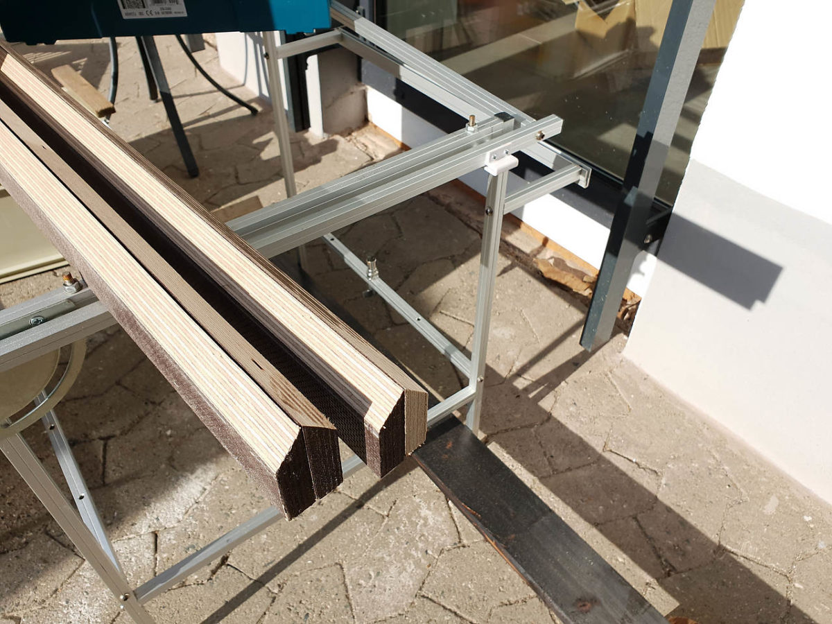 Am effektivsten schneidet man die Leisten, in dem man zunächst mit einem 90° Schnitt Streifen in doppelter Breite der späteren Keilleisten sägt und diese dann mit einem 45° Schnitt in der Mitte teilt. Damit erhält man zwei Keilleisten und muss zwischendurch die Säge nicht umstellen.