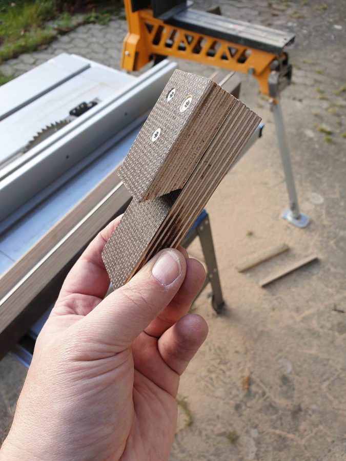Als Holz für die French Cleat Leisten eignen sich Birken-Multiplexplatten mit 18 mm Stärke oder eben Siebdruckplatten. Beides ist sehr stabil und vergleichsweise preiswert. Echtholzleisten aus Buche oder gar Eiche sind dafür viel zu teuer und in den passenden Abmessungen schwer zu bekommen.
