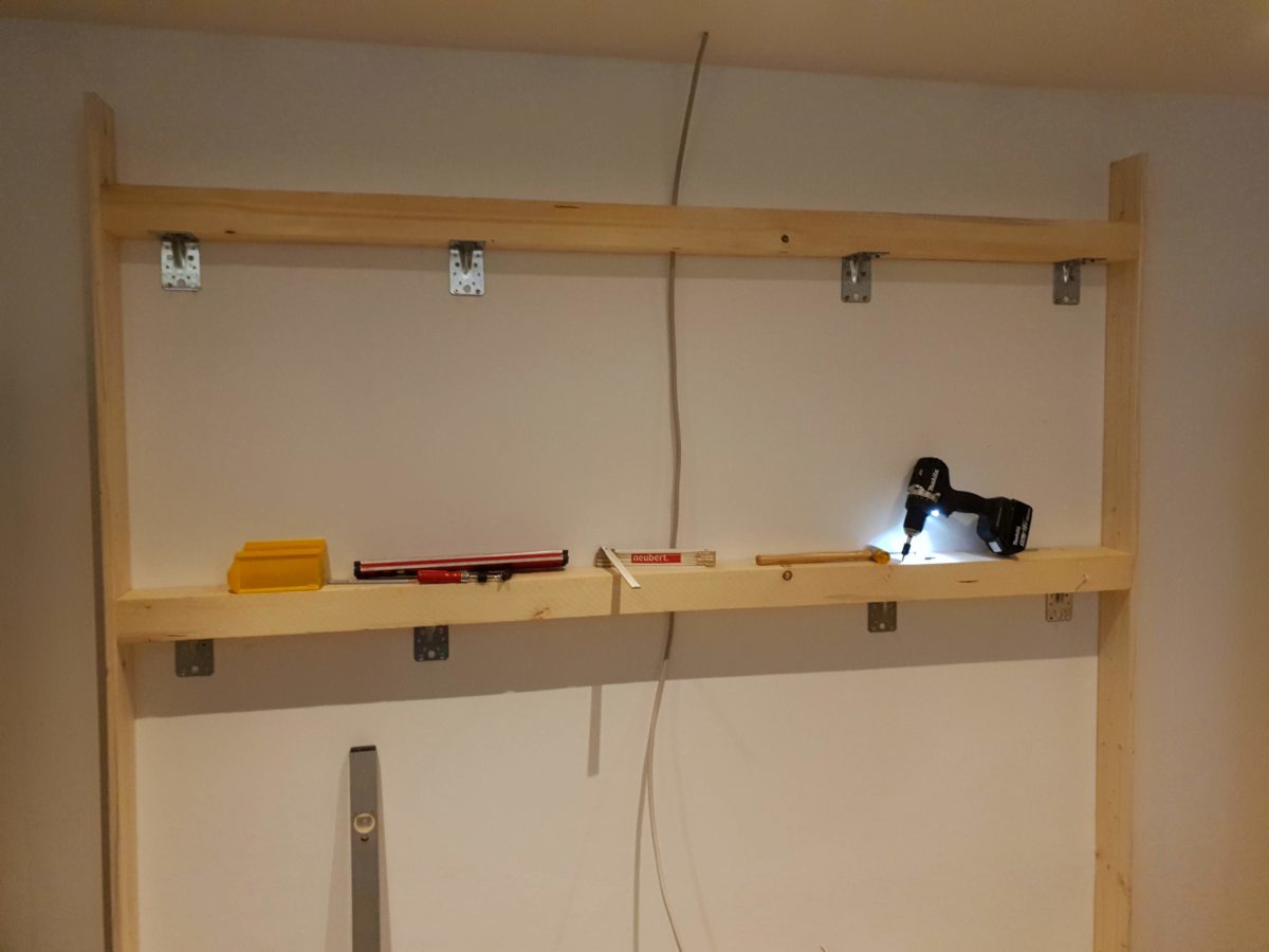 Der Rahmen besteht aus drei horizontalen Kanthölzern mit 78 x 98 mm, welche mit Metallwinkeln an der Wand montiert werden. Der Abstand richtete sich bei mir nach den Dämmplatten. Im unteren Bereich kommen die 100 x 65 cm Dämmplatten senkrecht zwischen die Balken und im oberen Bereich quer. Ich habe meine Konstruktion so ausgerichtet, dass ich praktisch nichts schneiden musste.
