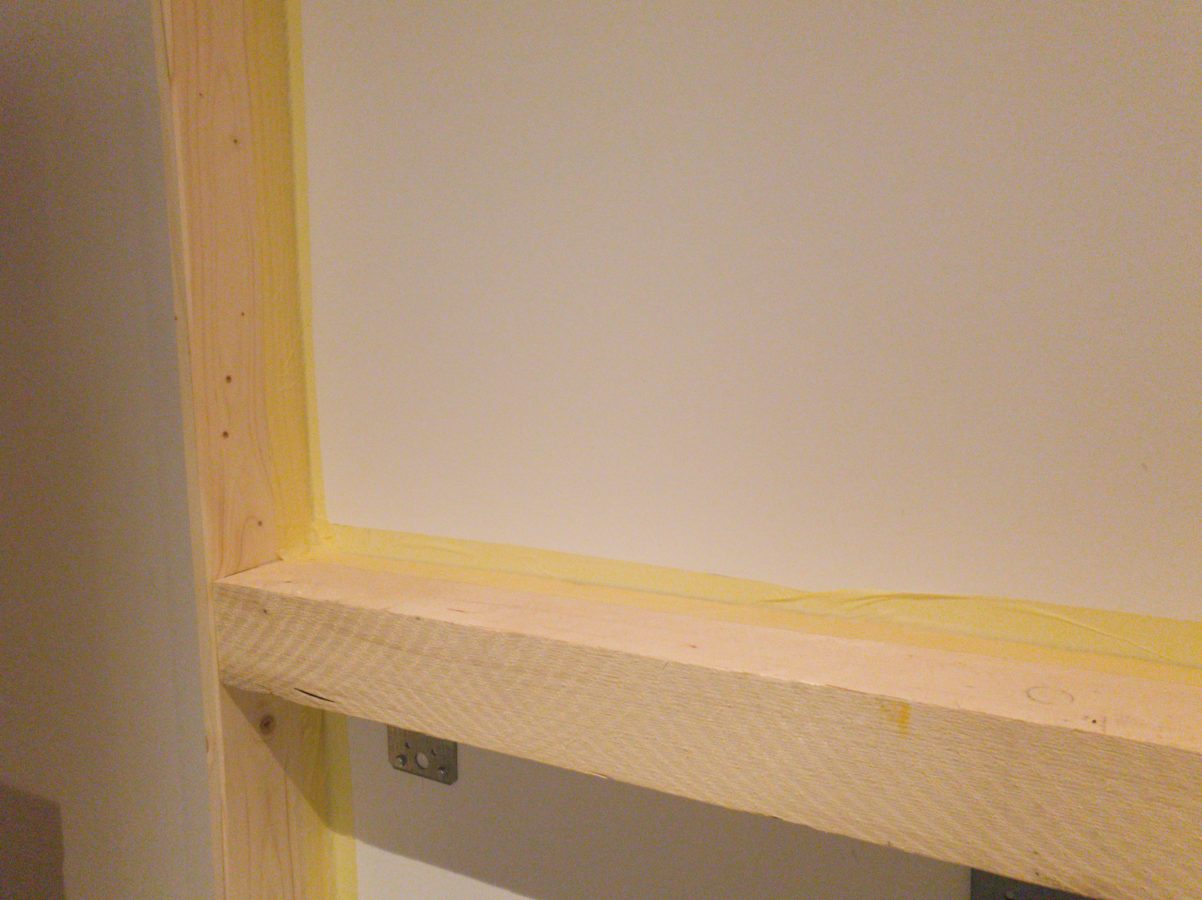 Damit auch keine Fasern aus den Isolierplatten nach außen können, habe ich die Ritzen zwischen Holz und Wand mit Klebeband verschlossen.