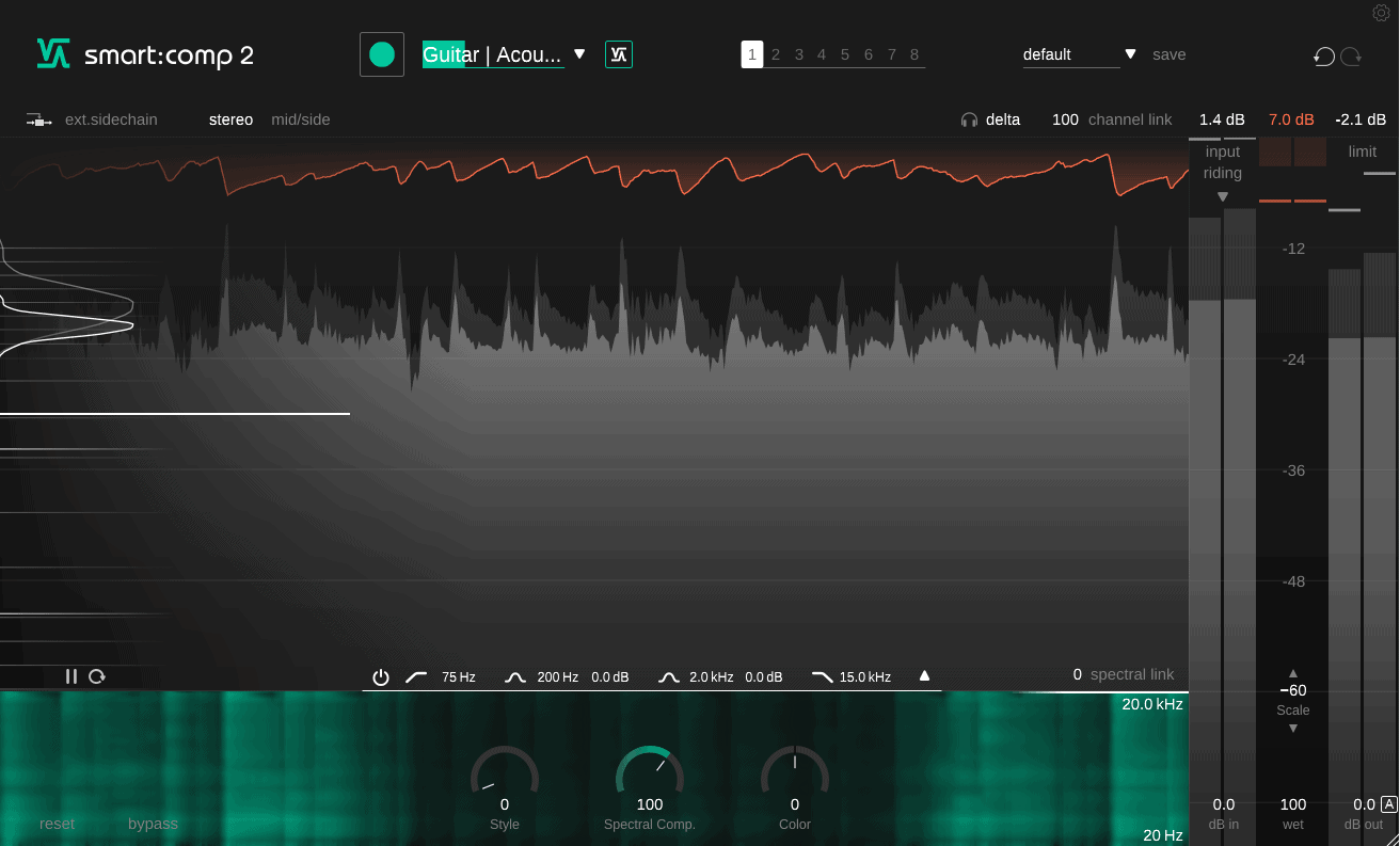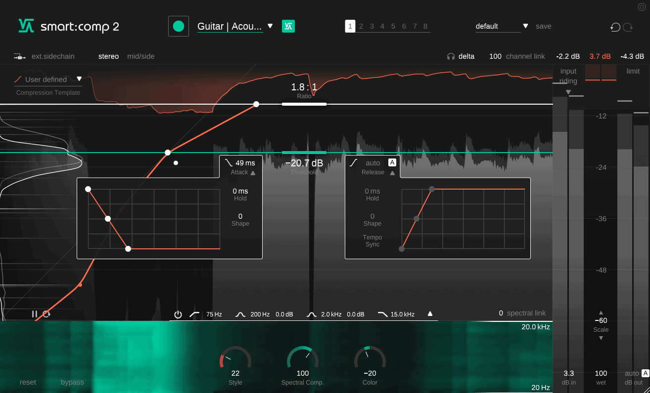 Die Funktionen des smart:comp 2 gehen aber noch viel weiter. Mit der spektralen Kompression wird das Signal in 2.000 Bänder aufgeteilt und analysiert. smart:comp 2 findet dann unerwünschte Resonanzen und gleicht diese automatisch aus. Das Ergebnis ist nicht weniger beeindruckend und führt zu sehr transparenten Resultaten und das Plugin geht hier sehr dezent und geschmackvoll heran. Über die „Color“ Einstellung kann man die Wirkung in den höheren oder tieferen Bereich verschieben und man kann die Funktion auch auf bestimmte Bereiche fokussieren lassen. Gerade Akustikgitarren, Interviews und Voiceover profitieren davon enorm.