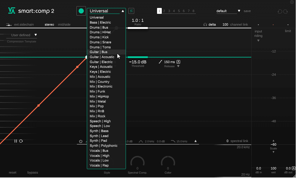 Das macht aber noch keinen innovativen Kompressor aus. Hier kommt das „smart“ des smart:comp ins Spiel: Statt Presets, wählt man aus einer Liste von 31 Profilen eines aus, das der zu bearbeitenden Quelle entspricht. Darunter findet man etwa E-Bass, Synth Lead oder Pads, Drum Bus und natürlich auch Mix-Anwendungen für unterschiedliche Musikstile.