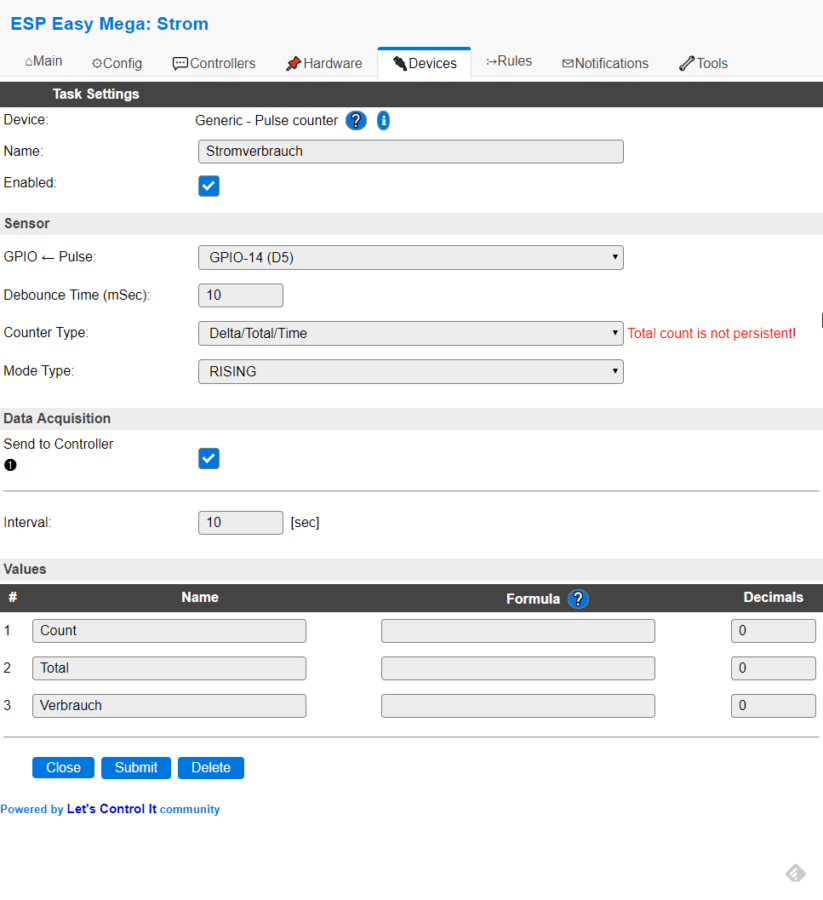 Eigentlich sollte es genügen, den TCRT5000 mit dem D0-Ausgang an einen Eingang des ESP8266 anzuschließen. Im Einstellungsmenü von ESPeasy kann man dann auswählen, auf welcher Signal-Flanke (bei steigender oder fallender Flanke) zählen soll und welche Entprellzeit (Bouncing) man möchte.