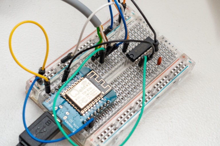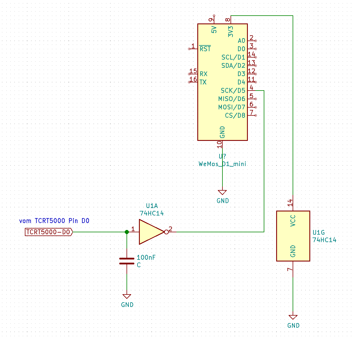 Die Schaltung ist sehr einfach: Der Eingang eines der 6 Schmitt-Trigger, wird mit einem 100 nF Kondensator gegen Masse versehen und wird mit dem D0-Ausgang des TCRT5000 verbunden. Der Ausgang des Schmitt-Triggers geht an den gewünschten Pin des ESP8266 (in meinem Fall D5/GPIO. Pin 7 des ICs kommt auf Masse und Pin 14 an die 3,3 Volt des ESP8266.