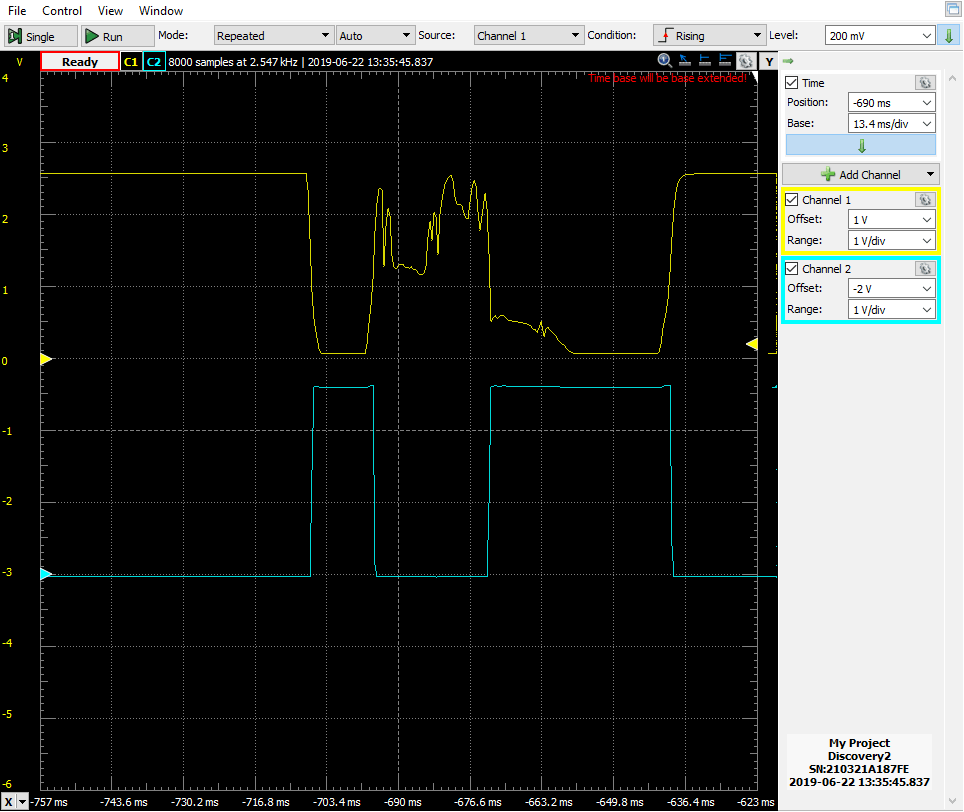 Ich habe einmal das Ausgangssignal des TCRT5000 vor und nach dem Schmitt-Trigger mit meinem Digilent Analog Discovery 2 gemessen:
