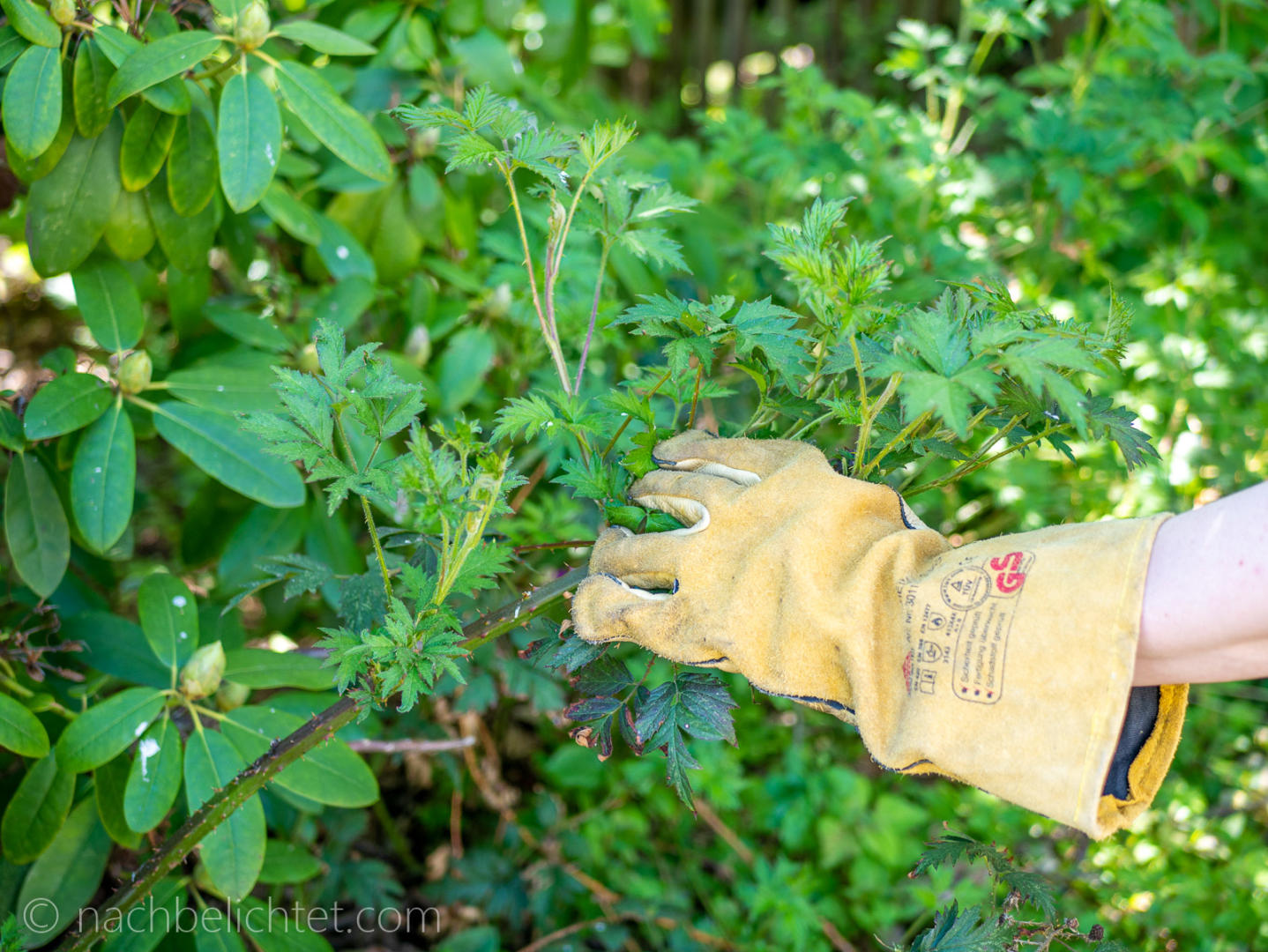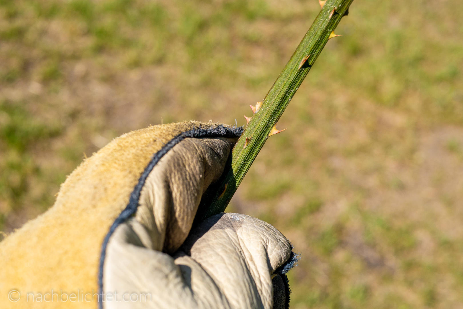 Mit diesen Handschuhen kann man die langen Ranken beherzt und bedenkenlos greifen und herausziehen. Bislang ging nicht ein Dorn durch den Handschuh. Natürlich solltet ihr auch entsprechendes Schuhwerk (Gummistiefel eignen sich besser als Turnschuhe), lange Hosen und langärmlige, aber glatte Kleidung tragen. Ideal eignen sich hier Schnittschutzhosen und Forstjacken, wie man sie beim Umgang mit Kettensägen trägt.